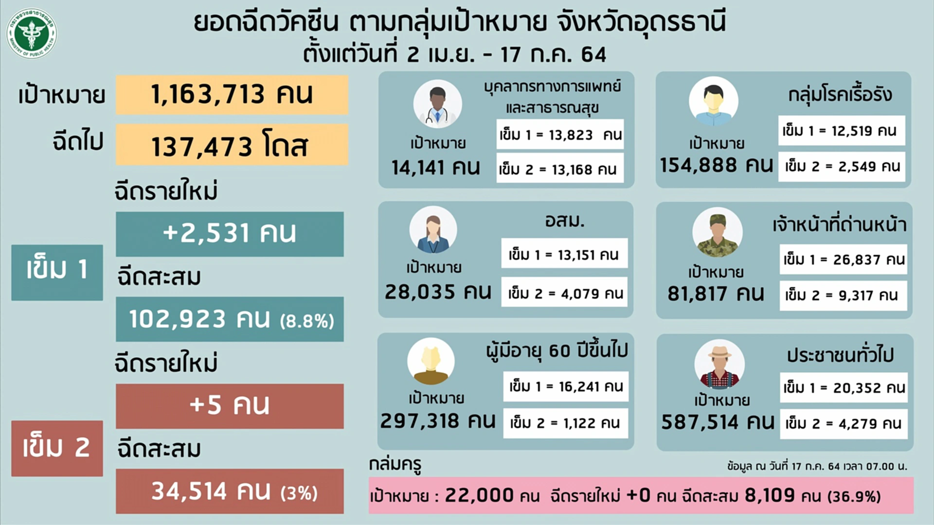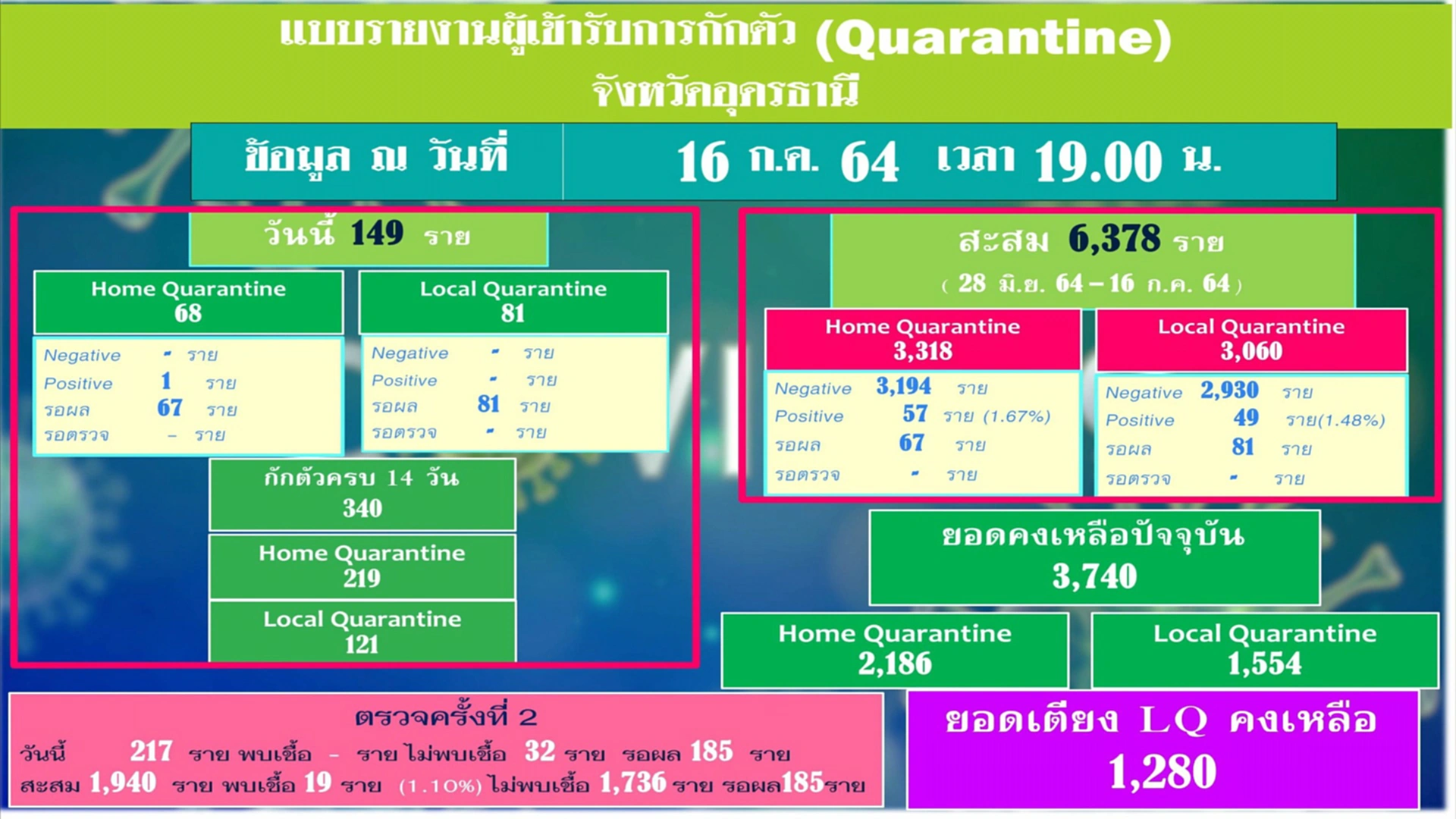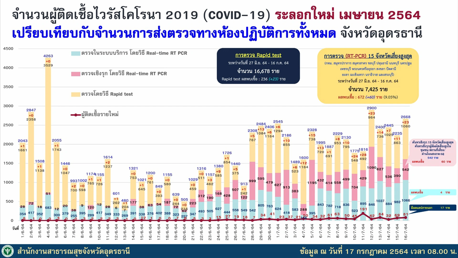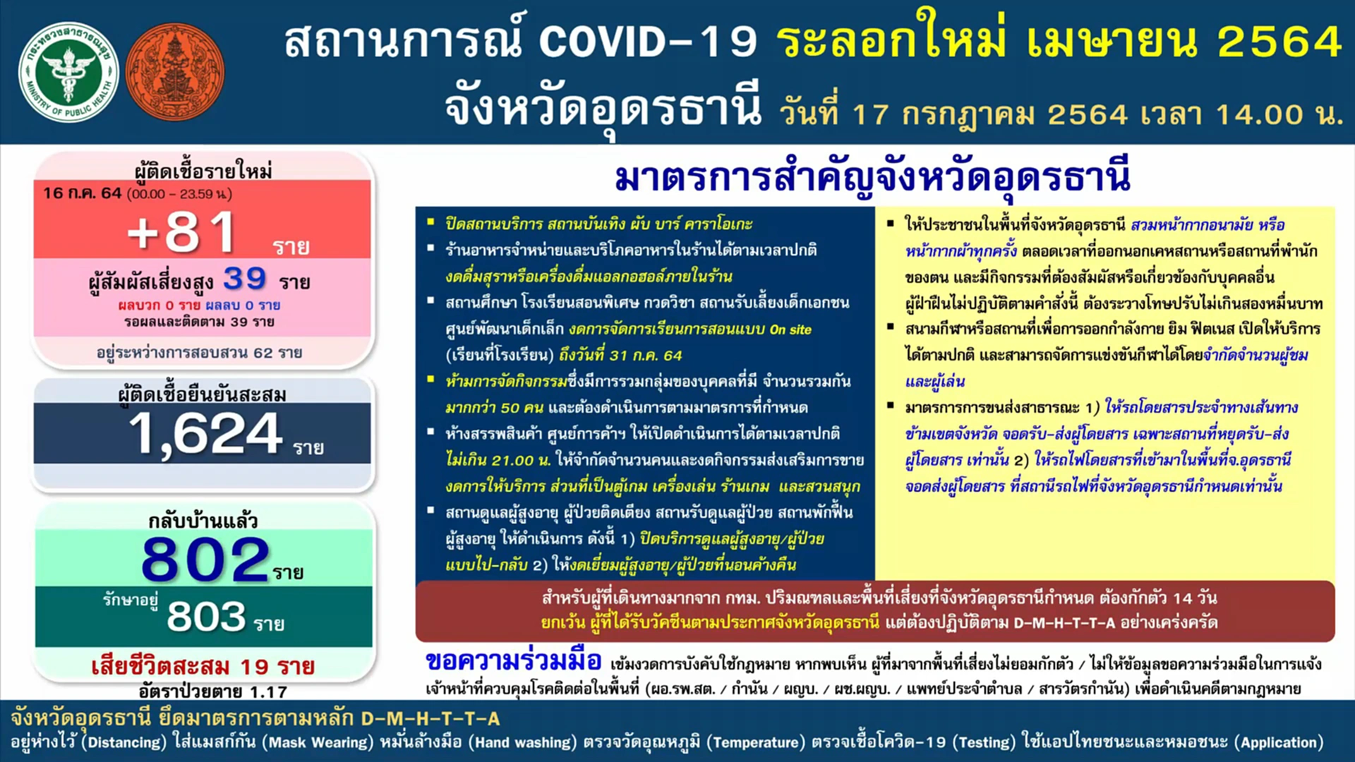 ในที่ประชุมรายงานว่า อุดรธานีพบผู้ติดเชื้อและผู้ป่วยเพิ่ม 81 ราย เป็นผู้เดินทางมาจาก กทม.-ปริมณฑล 77 ราย ยืนยันการติดเชื้อตรวจมาจาก กทม.17 ราย ติดเชื้อจากผู้สัมผัสเสี่ยงสูงในพื้นที่ 4 ราย ทำให้ผู้ติดเชื้อสะสม 1,624 ราย หายกลับบ้าน 802 ราย และรักษาตัวอยู่ 803 ราย ไม่มีผู้เสียชีวิตเพิ่ม สะสมอยู่ที่ 19 ราย โดยในวันพรุ่งนี้โครงการ “นำลูกหลานชาวอุดรกลับบ้าน” จะมีการเดินทางกลับมา 125 ราย เป็นผู้ยืนยันติดเชื้อ 63 ราย ผู้ยังไม่ได้รับการตรวจเชื้อ 62 ราย จำนวนนี้มีไข้ 12 ราย