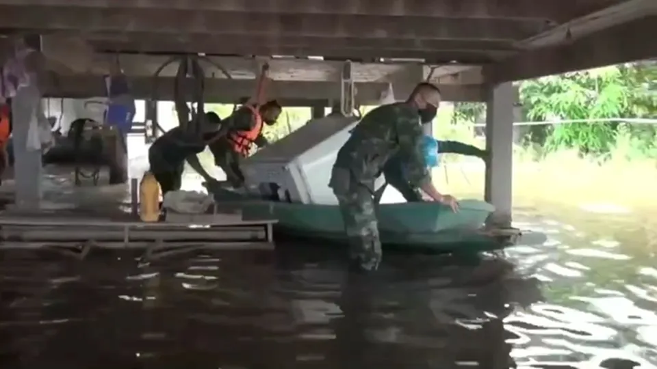 ที่ ต.บางแตน อ.บ้านสร้าง จ.ปราจีนบุรี กำลังทหารจาก กองพันทหารราบที่ 1 กรมทหารราบที่ 2 รักษาพระองค์มาช่วยเหลือขนสิ่งของและช่วยเหลือย้ายผู้ป่วยติดเตียง ขึ้นชั้นบนของบ้าน เพื่อหนีน้ำที่มีสูงความสูงประมาณ 50-60 เซนติเมตร โดยมีข้าวของเครื่องใช้ต่างๆ เช่น ตู้กับข้าว เครื่องซักผ้า โต๊ะ เก้าอี้ ไว้ยังที่ปลอดภัย