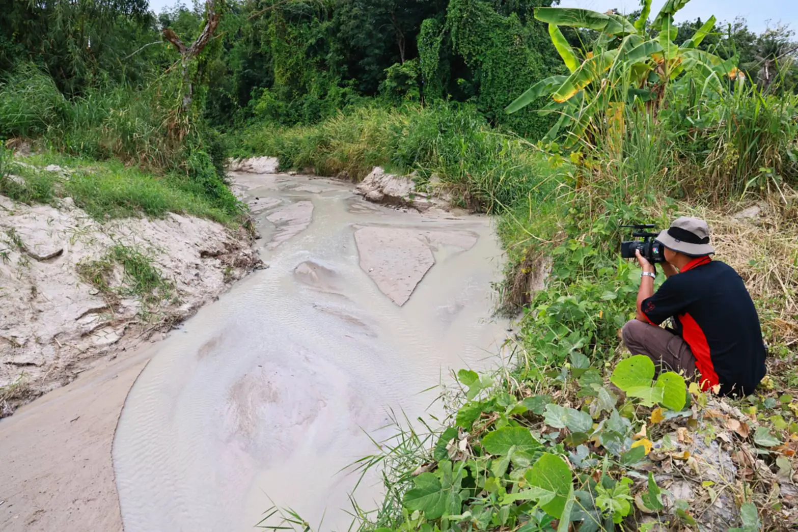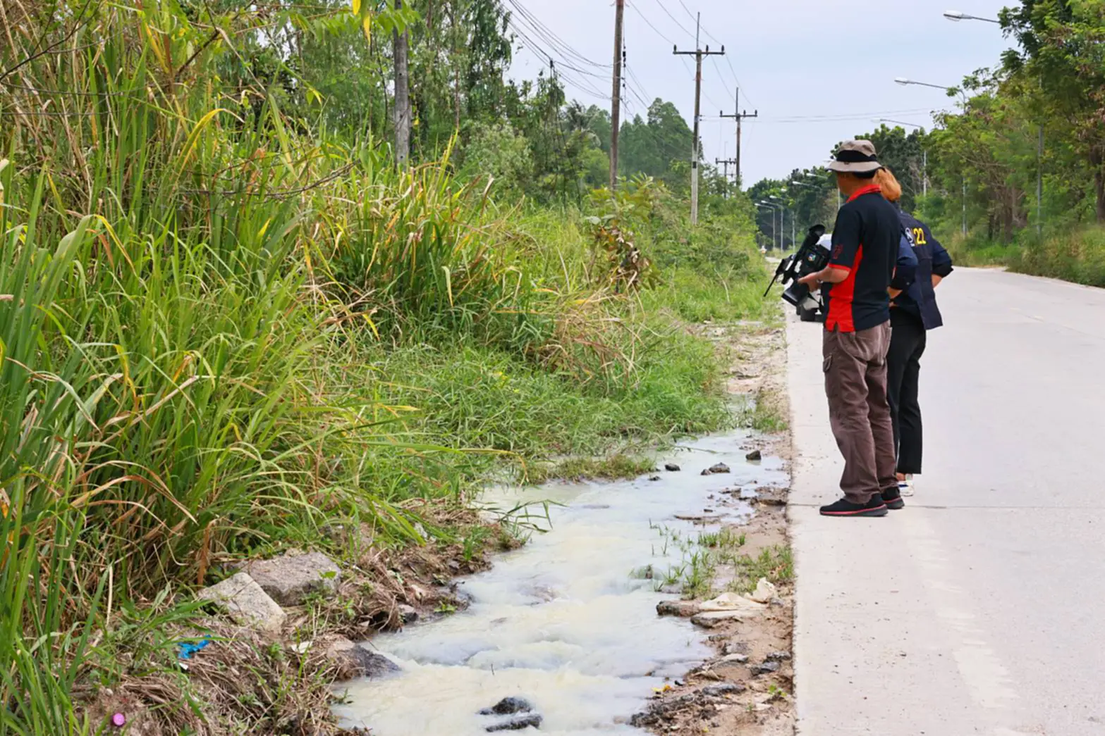 โดยคาดว่ามีการต่อท่อใต้ดินเพื่อให้มาโผล่ริมถนน หลังมีลักษณะน้ำผุดขึ้นมาจากใต้ดิน ก่อนไหลลงลำราง และน้ำบางส่วนไหลเข้าที่ชาวบ้านที่มีการปลูกมันสำปะหลังด้วย ก่อนที่น้ำเสียดังกล่าวจะไหลลงมายังบริเวณสะพานคลองหลอด 8 ต.ห้วยโป่ง โดยน้ำมีลักษณะสีขาวขุ่นข้นไหลปนมากับทรายเป็นจำนวนมาก ทั้งนี้ชาวบ้านในพื้นที่ยืนยันว่า น้ำลักษณะขาวขุ่นดังกล่าว เกิดจากการชะล้างของโรงทรายของนายทุนในพื้นที่ ซึ่งเมื่อไหลลงลำรางจะทำให้ตื้นเขิน มีกลิ่นเหม็น ปลาตาย และน้ำไม่สามารถนำไปใช้สำหรับพืชผลทางการเกษตรได้ โดยจะพบเห็นบ่อยครั้ง สาเหตุคาดว่าเกิดจากการที่นายทุนลักลอบปล่อยทิ้ง หรืออาจเกิดจากบ่อพักน้ำชะล้างล้นแล้วไหลออกมาภายนอก อย่างไรก็ตามชาวบ้านอยากให้หน่วยงานที่เกี่ยวข้องได้เข้ามาตรวจสอบอย่างเร่งด่วนด้วย