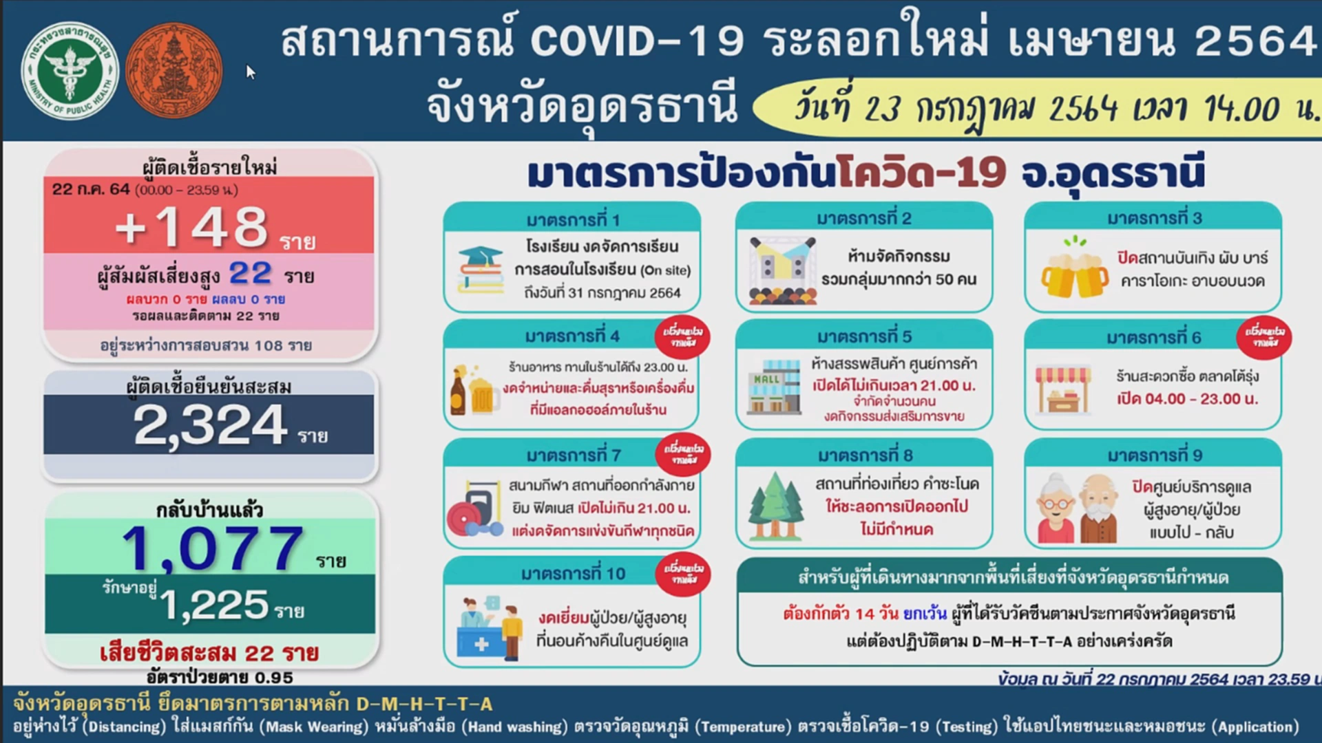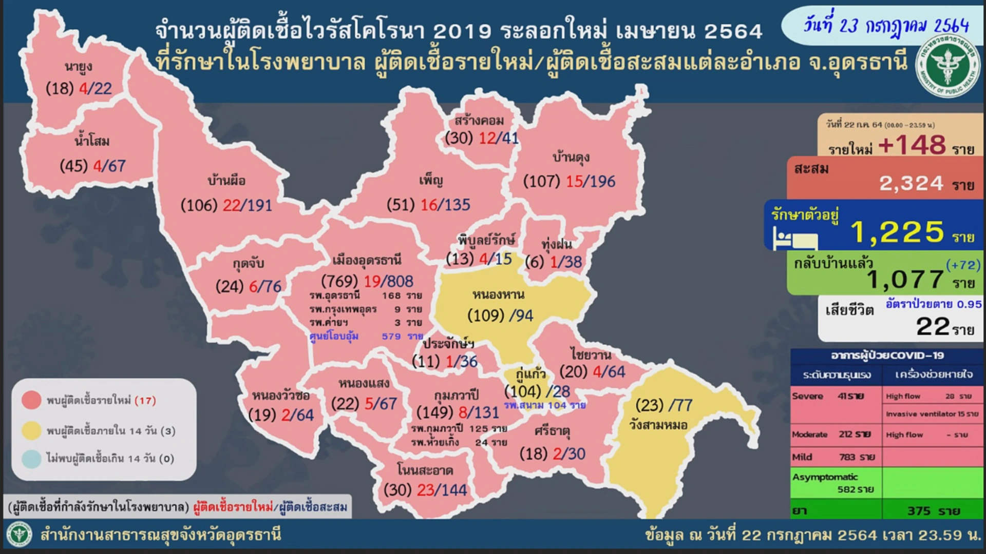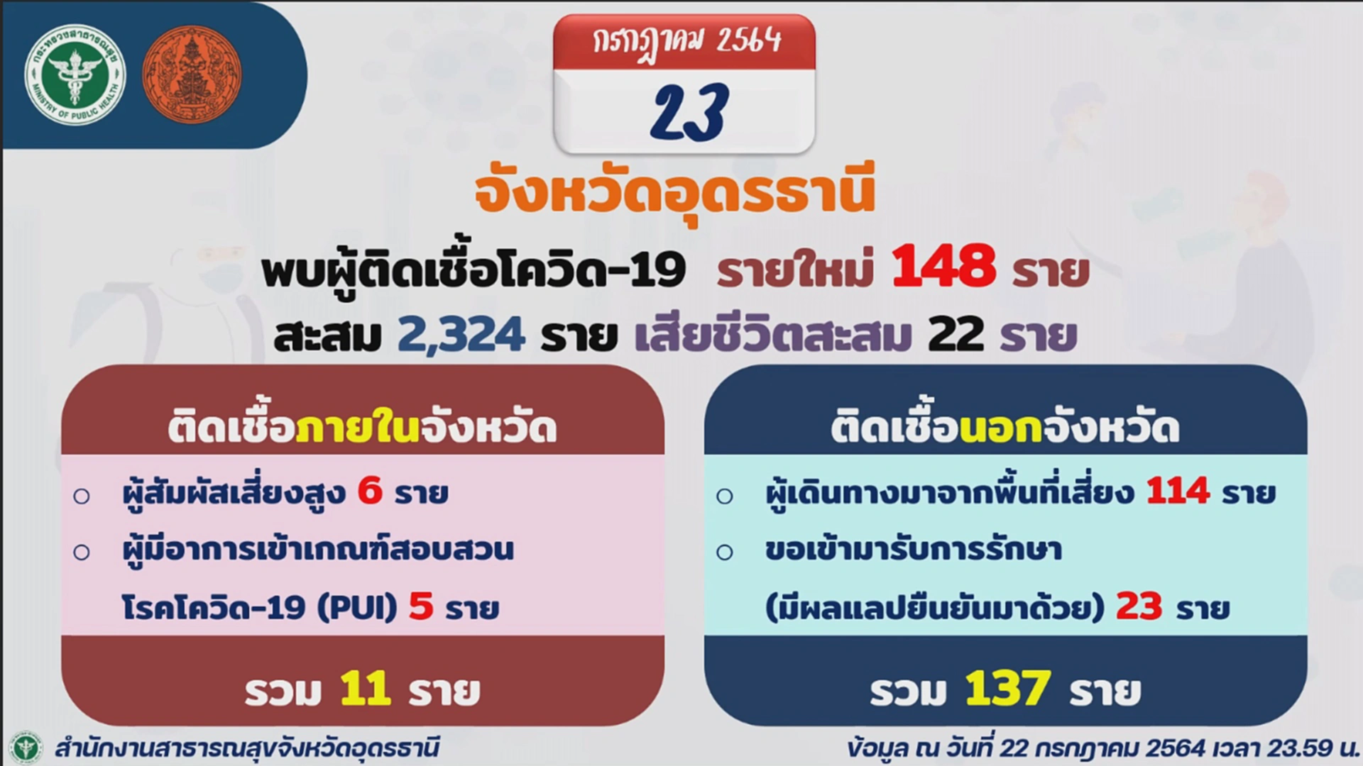 วันที่ 23 กรกฎาคม 2564 เวลา 14.00 น. นายอุเทน หาแก้ว รองนายแพทย์สาธารณสุข จ.อุดรธานี พญ.สุรีรัตน์ วัชรสุวรรณเสรี อายุรแพทย์ โรคติดเชื้อ รพ.ศูนย์อุดรธานี ร่วมแถลงสถานการณ์โควิด-19 ในพื้นที่อุดรธานี จากสถานการณ์ของประเทศยังสูงอยู่ ทำให้ผู้ติดเชื้อและผู้ป่วยเดินทางกลับภูมิลำเนาอยู่ โดยอุดรธานีพบผู้ติดเชื้อเพิ่ม 148 ราย เป็นผู้ติดเชื้อมาจากพื้นที่เสี่ยง 137 ราย (เป็นผู้ป่วยยืนยันแล้ว 23 ราย) ทำให้ยอดสะสม 2,324 ราย หายกลับบ้าน 1,077 ราย รักษาตัวอยู่ 1,225 ราย เสียชีวิตสะสม 22 ราย