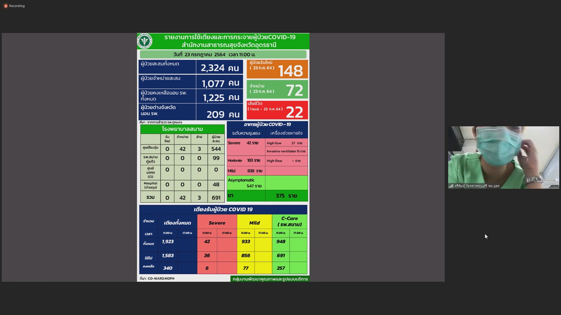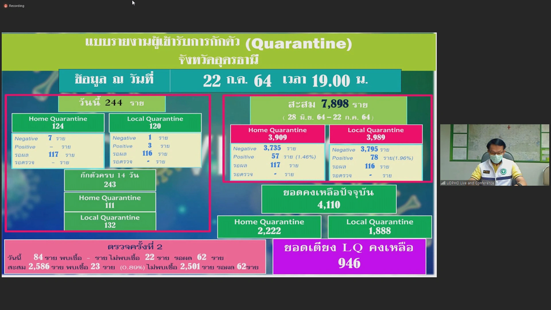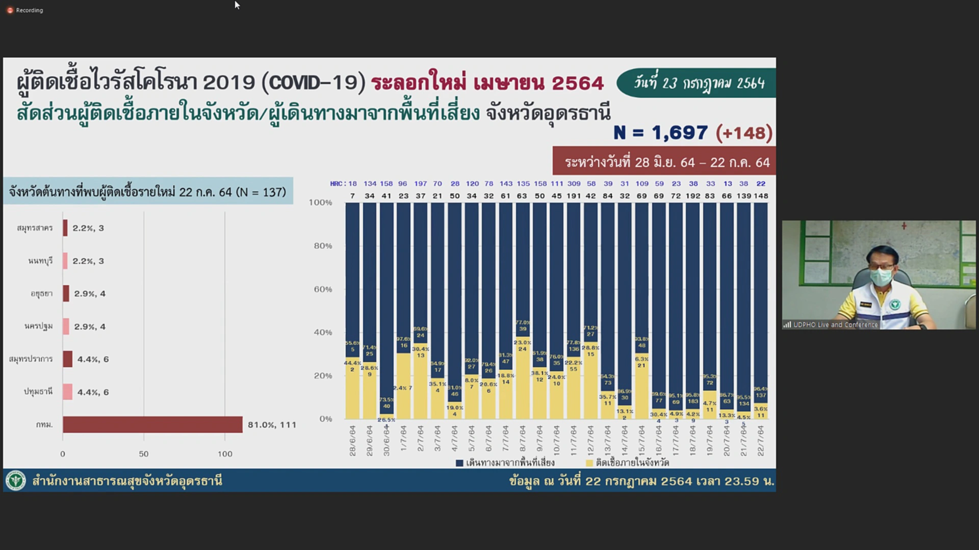 วันที่ 23 กรกฎาคม 2564 เวลา 14.00 น. นายอุเทน หาแก้ว รองนายแพทย์สาธารณสุข จ.อุดรธานี พญ.สุรีรัตน์ วัชรสุวรรณเสรี อายุรแพทย์ โรคติดเชื้อ รพ.ศูนย์อุดรธานี ร่วมแถลงสถานการณ์โควิด-19 ในพื้นที่อุดรธานี จากสถานการณ์ของประเทศยังสูงอยู่ ทำให้ผู้ติดเชื้อและผู้ป่วยเดินทางกลับภูมิลำเนาอยู่ โดยอุดรธานีพบผู้ติดเชื้อเพิ่ม 148 ราย เป็นผู้ติดเชื้อมาจากพื้นที่เสี่ยง 137 ราย (เป็นผู้ป่วยยืนยันแล้ว 23 ราย) ทำให้ยอดสะสม 2,324 ราย หายกลับบ้าน 1,077 ราย รักษาตัวอยู่ 1,225 ราย เสียชีวิตสะสม 22 ราย