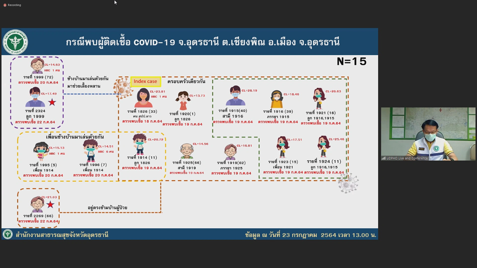 นายอุเทน หาแก้ว รอง สสจ.อุดรธานี กล่าวด้วยว่า “เคสครอบครัวใหญ่เชียงพิณ” พบผู้ติดเชื้อเพิ่มอีก 2 ราย รวมเป็น 15 ราย เป็นผู้สูงอายุ 4 ราย เด็ก 5 ราย จากที่พบติดเชื้อคนแรกเป็นหญิงชาว สปป.ลาว มีครอบครัวที่อุดรธานี มาทำงานเป็นแม่บ้านในตัวเมือง และเมื่อตรวจผู้สัมผัสเสี่ยงสูงพบในครอบครัวบ้านใกล้เรือนเคียงติด ผู้สัมผัสเสี่ยงสูงที่กักตัวอยู่ 21 ราย น่าจะสามารถควบคุมได้ โดยมีข่าวลือเรื่องเป็นพนักงานในห้างสรรพสินค้า และเป็นพนักงานของร้านในตลาดผ้า ไม่เป็นความจริงแต่อย่างใด