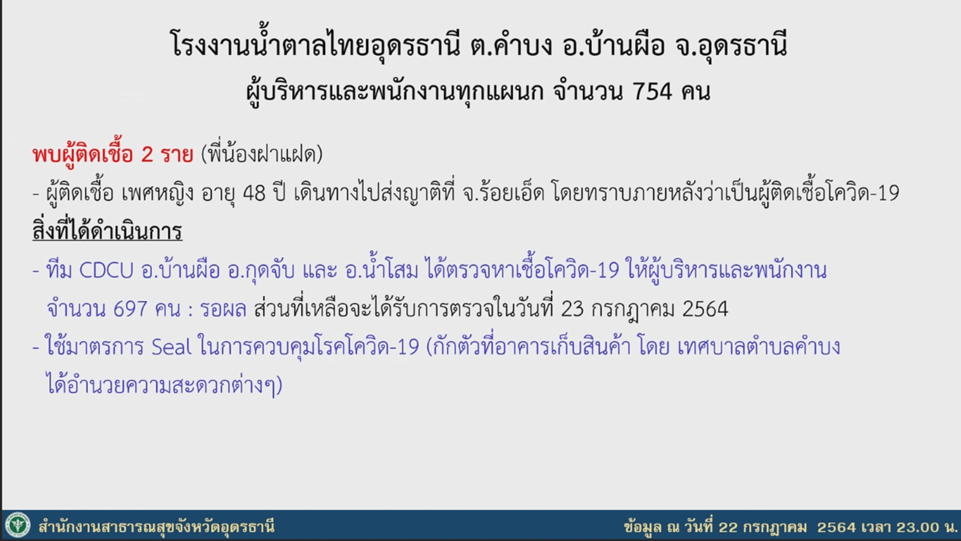 เมื่อวานนี้ท่านผู้ว่า และนายอำเภอ ลงพื้นที่ติดตามทีมสืบสวนควบคุมโรคจาก อ.บ้านผือ น้ำโสม และกุดจับ ระดมลงตรวจหาเชื้อแบบ PCR ผู้บริหาร พนักงาน ลูกจ้าง รวม 697 คน จะรู้ผลตรวจในวันนี้ ระห่างการรอผลให้ทุกคนกักตัวอยู่ในโรงงาน โดยผู้บริหารจัดให้แยกกักตัวเป็นแผนกในห้องทำงานของตัวเอง และพื้นที่โกดังเก็บสินค้า ส่วนญาติพี่น้องก็นำเอาเครื่องนอน เสื้อผ้า และของใช้ส่วนตัวมาให้ และมีเทศบาลตำบลคำบงเข้ามาช่วยดูแลเรื่องอาหาร 3 มื้อ วันนี้จะตรวจหาเชื้อเพิ่ม พนักงาน-ลูกจ้างที่ตกค้าง และครอบครัวญาติพี่น้องผู้ตรวจพบเชื้อพร้อมให้คำแนะนำกักตัวที่บ้าน”