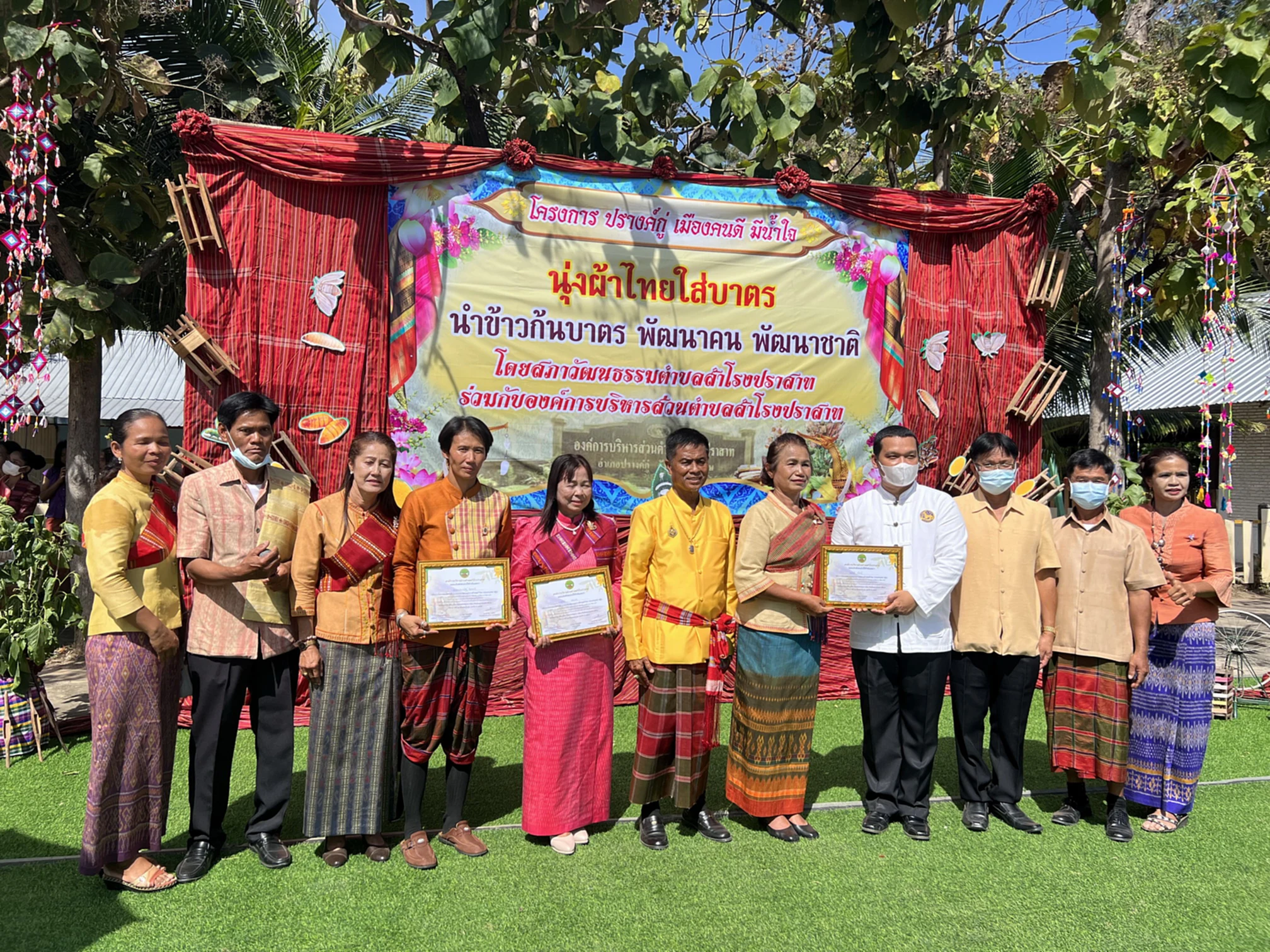 วันที่ 12 พ.ย. 2565 ผู้สื่อข่าวรายงานว่า ที่ อบต.สำโรงปราสาท อ.ปรางค์กู่ จ.ศรีสะเกษ นายวิทยา ชัยเดชกำจร นายอำเภอปรางค์กู่ ได้เดินทางไปเป็นประธานในพิธีเปิดโครงการ ปรางค์กู่เมืองคนดี มีน้ำใจ นุ่งผ้าไทยใส่บาตร นำข้าวก้นบาตร พัฒนาคน พัฒนาชาติ ซึ่งนายประดิษฐ์ ชาญเชี่ยว นายก อบต.สำโรงปราสาท พร้อมด้วย รอง นายก อบต. ส.อบต. กำนัน ผู้ใหญ่บ้าน ชาวบ้านทุกหมู่บ้านในเขต ต.สำโรงปราสาท ได้ร่วมกันจัดงานนี้ขึ้น โดยมีกิจกรรมประกอบด้วย พิธีทางศาสนา พิธีทอดผ้าป่าสามัคคี การตัดสินการประกวดการแต่งกายด้วยผ้าไหม พิธีมอบใบประกาศเกียรติคุณการประกวดการแต่งกายด้วยชุดผ้าไหมในแต่ละประเภท พิธีตักบาตรข้าวสารอาหารแห้ง ณ บริเวณถนนหน้า อบต.สำโรงปราสาท โดยมี นายกมล ชัยกัณฑะ ท้องถิ่นจังหวัดศรีสะเกษ พร้อมด้วย น.ส.วิลดา อินฉัตร ว่าที่ผู้สมัคร ส.ส.ศรีสะเกษ เขต 9 พรรคเพื่อไทย นายเสกสิทธิ์ แสนทวีสุข รอง ผอ.สพป.ศรีสะเกษ เขต 3 นายเอกชัย ว่องไว พัฒนาการอำเภอปรางค์กู่ นายก้าวเทพ อสิพงษ์ ท้องถิ่นอำเภอปรางค์กู่ นายสมร จันทพันธ์ กำนัน ต.สำโรงปราสาท นำคณะหัวหน้าส่วนราชการระดับอำเภอ นายก อบต.ทุก อบต. กำนัน ผู้ใหญ่บ้านทุกหมู่บ้าน ผอ.ร.ร.ครู น.ร. ชาวบ้านทุกหมู่บ้านในเขต ต.สำโรงปราสาท พากันแต่งกายด้วยไหมและผ้าพื้นเมืองอย่างสวยงาม มาร่วมพิธีครั้งนี้จำนวนมาก