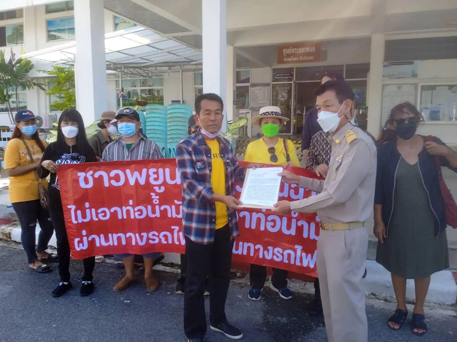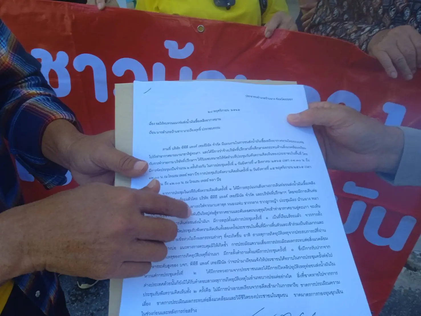 เวลา 10.00 น.ที่ ผ่านมา 28/11/65 ที่บริเวณหน้าศูนย์ราชการ อ.บ้านฉาง จ.ระยอง นายอำนวย เกษตรสินธุ์นุกูล ปลัดอาวุโส เป็นตัวแทนนายอำเภอบ้านฉาง รับหนังสือให้ทบทวนโครงการวางท่อส่งน้ำมันเชื้อเพลิงอากาศยาน ไปยังท่าอากาศยานนานาชาติอู่ตะเภาระยอง-พัทยาหลังบริษัท พีทีทีแทงค์ เทอร์มินอลได้ว่าจ้างบริษัทที่ปรึกษาเพื่อศึกษาผลกระทบสิ่งแวดล้อมกับการทำรายงานจัดทำเวทีรับฟังความคิดเห็นของประชาชนในพื้นที่ครั้งที่ 1 เมื่อช่วงเดือนสิงหาคม 65 และครั้งที่ 2 เมื่อช่วงเดือนพฤศจิกายน 65 ที่โรงแรมเพลย์พลาบีชที่ผ่านมา