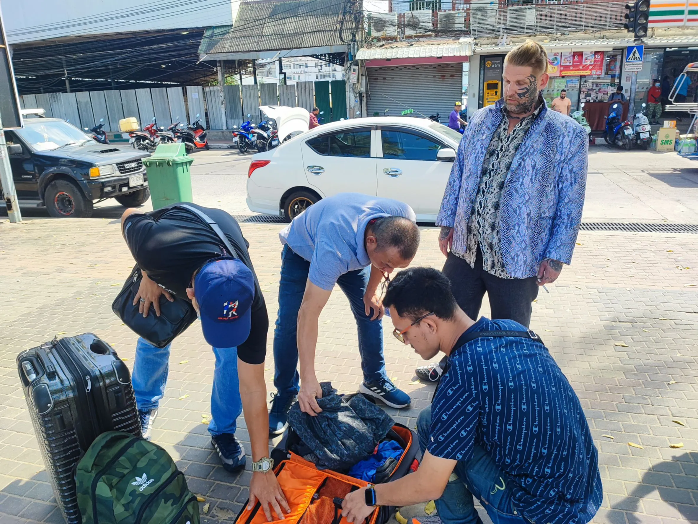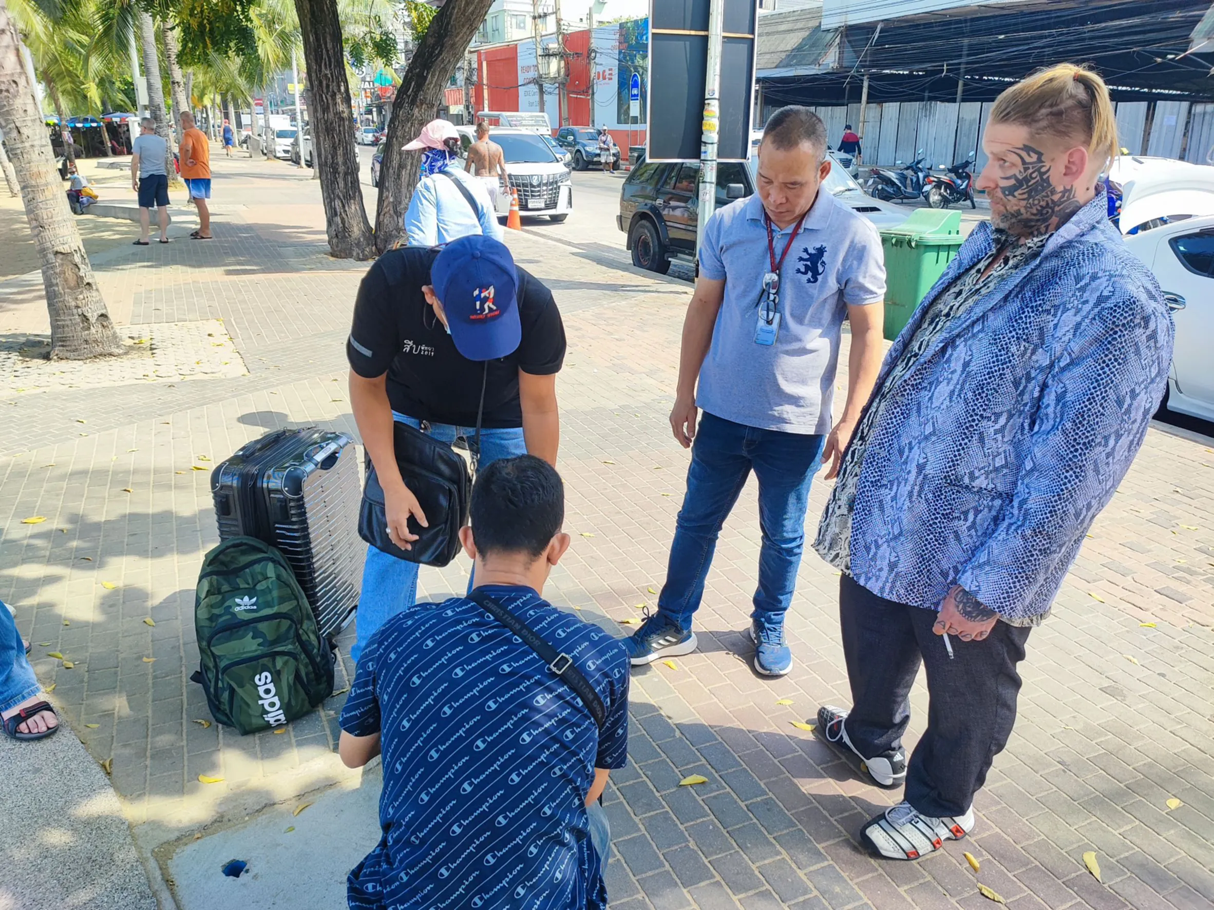 โดยขณะตรวจสอบบริเวณปากซอย 13/3 ถนนเลียบชายหาดพัทยา พบชาวต่างชาติมีรอยสักที่ใบหน้า ใส่ชุดสูทหนังหรูหรา สะพายกระเป๋าเป้ต้องสงสัยจึงเข้าตรวจสอบ จากการตรวจสอบ พบยาไอซ์บรรจุในถุงซิบพลาสติก อยู่ในกระเป๋าสะพายสีดำใบเล็ก ส่วนการตรวจค้นในกระเป๋าสะพายใบใหญ่สีเขียว พบอาวุธปืน ขนาด .380 colt defender สีทอง ตรวจสอบพบลูกปืนอยู่ในรังเพลิง 1 ลูก ในแมกกาซีน 5 ลูก และยังพบกระสุนปืนอีกจำนวน 58 ลูก บรรจุในกล่อง เจ้าหน้าที่ตำรวจจึงควบคุมตัวมาสอบสวนที่ สภ.เมืองพัทยา