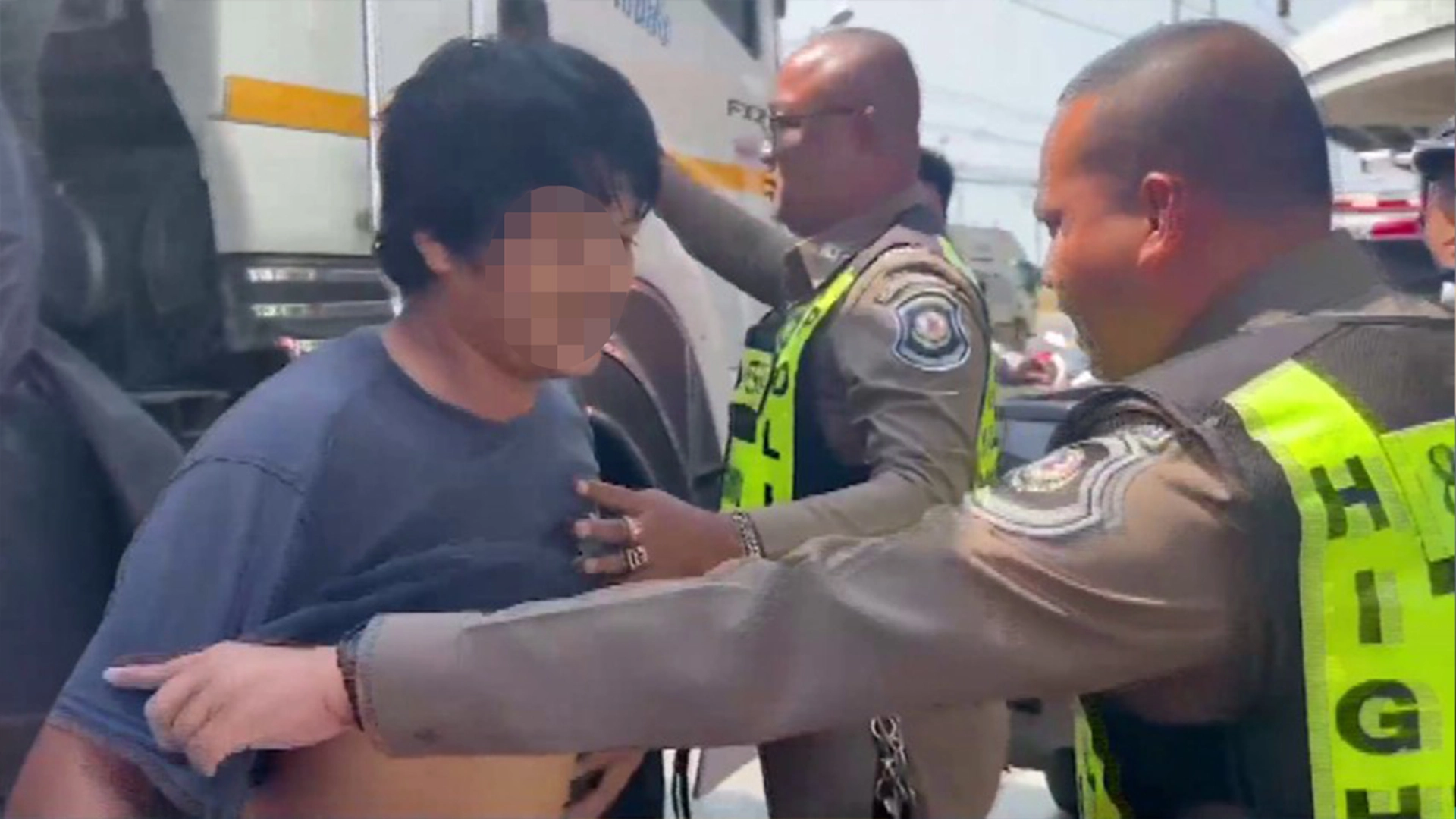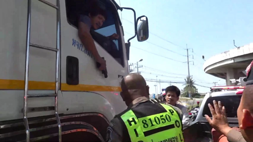 เวลา 12.00 น. วันที่ 10 ก.พ. 66 ร.ต.อ.ยุทธพงษ์ สมคำเพชร รอง สว.จราจร สภ.บางปะกง พร้อมกำลัง และสายตรวจรถจักรยานยนต์ ได้รับการประสานจาก ร.ต.อ.รัศมี คำศรีแก้ว รอง สว.ส.ทล.1 กก.8 บก.ทล. ให้ช่วยสกัดจับรถพ่วง 22 ล้อ อีซูซุ สีขาว ทะเบียนตัวแม่ 70-8014 นครราชสีมา ทะเบียนตัวพ่วง 70-8015 นครราชสีมา หลังคนขับโชว์อาวุธปืนออกมาข่มขู่รถที่เฉี่ยวชนกันบนมอเตอร์เวย์ กม.95 ขาเข้ากรุงเทพฯ แต่รถคันดังกล่าวได้ขับหลบออกมาจากด่านบางพระวิ่งเส้นบายพาสชลบุรี ก่อนจะวิทยุประสานตำรวจพื้นที่ชลบุรี และพื้นที่ สภ.บางปะกง จนสุดท้าย รถบรรทุกหกล้ออีซูซุ สีขาว ทะเบียน 70-6060 สุพรรณบุรี แบบเป็นรถสไลด์ ที่มีนายกิตติพงษ์ มีเพียร อายุ 38 ปี ซึ่งเป็นรถคู่กรณีหลังถูกเฉี่ยวชนได้ขับติดตามมา พร้อมโทรแจ้งตำรวจตามเส้นทางให้ช่วยสกัดจับ ซึ่งพอเข้าเขตถนนเทพรัตน(บางนา-ตราด) กม.53 ช่องทางด่วน ขาเข้ากรุงเทพฯ