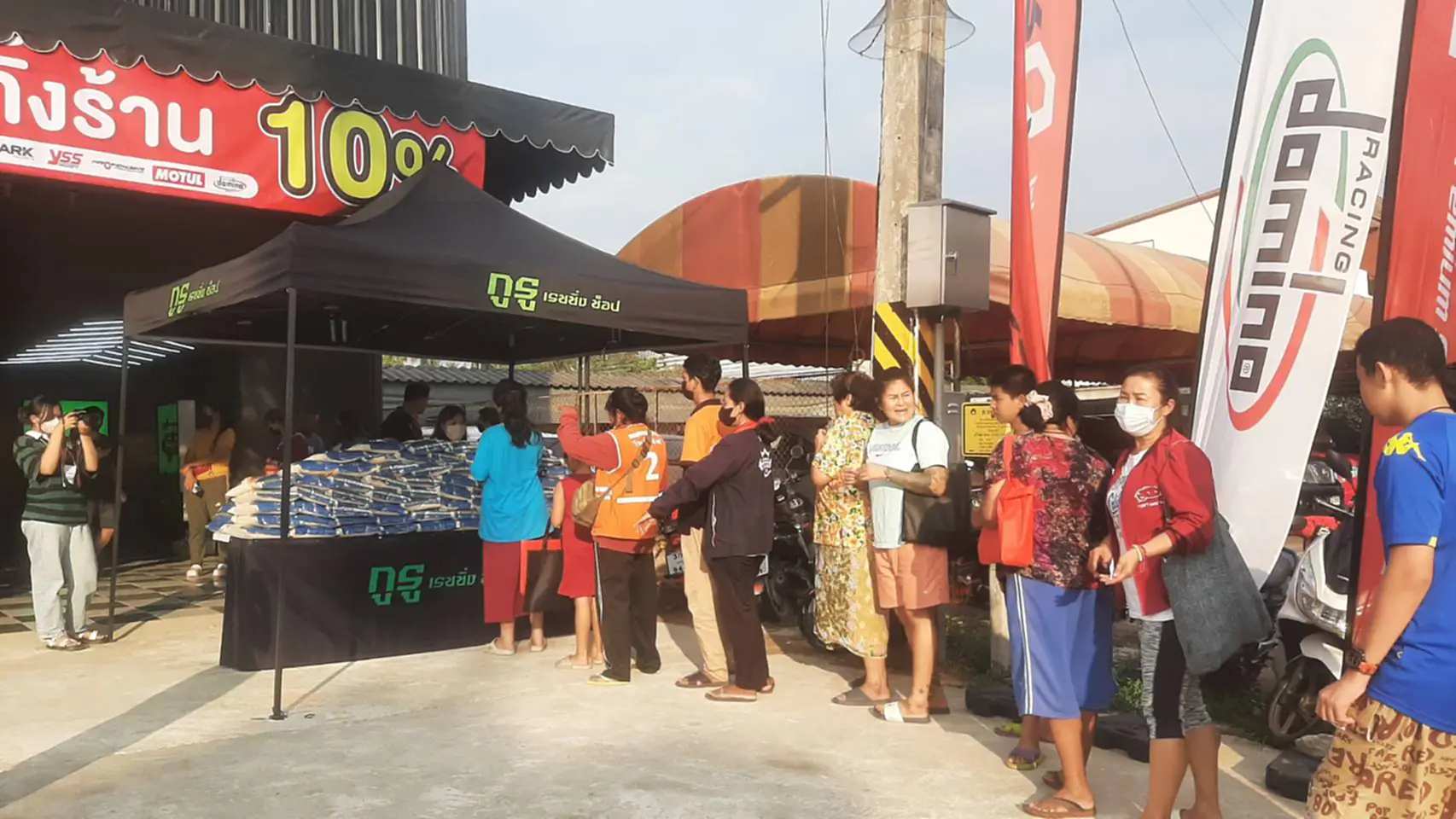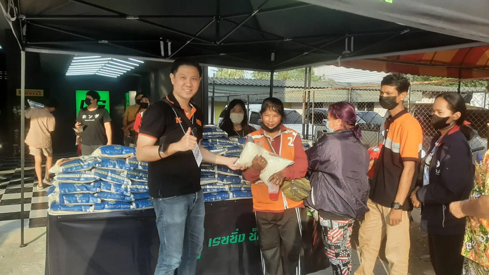 ที่ร้าน กูรู เรซซิ่งช๊อป ต.บ่อวิน อ.ศรีราชา จ.ชลบุรี วันนี้มีชาวบ้าน กลุ่มผู้ใช้แรงงาน ต่างยื่นรอเข้าแถว เพราะทางร้านได้แจกข้าวสารถุงละ 5 กิโลกรัมให้กับชาวบ้านไปกินฟรีโดยนายพุฒิสิทธิ์ พุฒิเบญจสิทธ์ ผู้บริหารฮอนด้า เอเชีย ซิตี้ มอเตอร์ จำกัด กิจกรรมดังกล่าวจัดขึ้นรวมข้าวสารทั้งสิ้น 500 กิโลกรัม