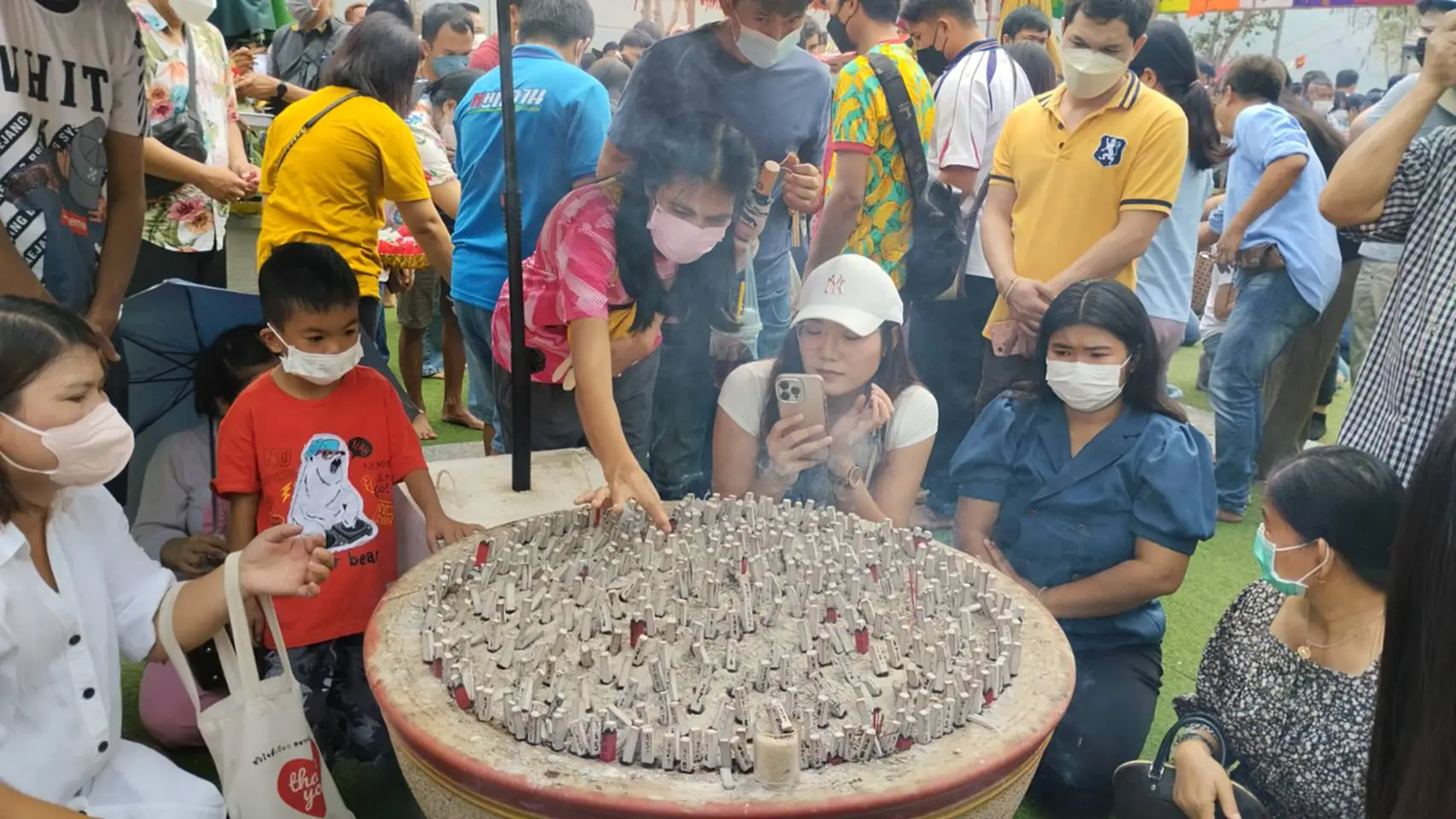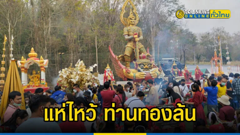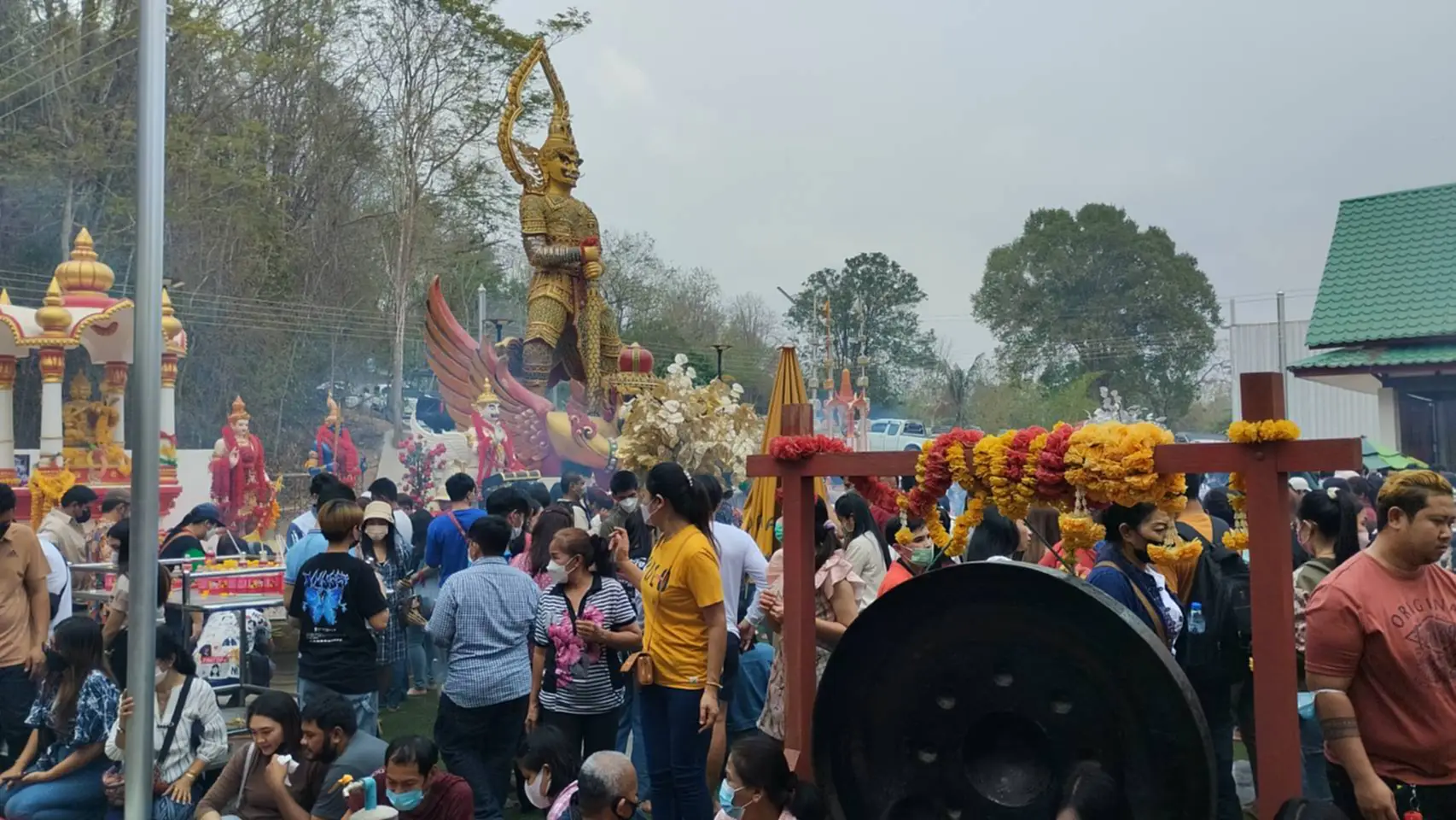 เวลา11.30น.วันที่ 12 มีนาคม 66 ที่ริมอุโบสถวัดเขาช่องลม ต.เขาคันทรง อ.ศรีราชา จ.ชลบุรี โดยในวันนี้เป็นวันอาทิตย์ใกล้หวยออกได้มีประชาชนทยอยเดินทางมากันมาอย่างต่อเนื่อง ตั้งแต่เช้าซึ่งทำให้ทางเข้าวัดเขาช่องลมรถยนต์ติดกันยาวกว่า 3 กิโลเมตร โดยรถเคลื่อนตัวได้อย่างช้าๆตลอดเส้นทางเข้าวัด โดยทุกคนเดินทางมา เพื่อมากราบไหว้ “ท้าวเวสสุวรรณทรงราหู” (ท่านทองล้น) องค์ใหญ่สูง 9.9 เมตร ที่ตั้งตระหง่านอยู่ที่หน้าเขาช่องลมโดยทุกคนที่มาต่างเข้าแถวเพื่อทำบุญขอรับเครื่องเซ่นไหว้จากทางวัดกันเป็นแถวยาวเป็นระเบียบหลังจากที่ไหว้องค์ท้าวเวสสุวรรณด้วยเครื่องเซ่นไหว้แล้ว ก็จุดธูปเสี่ยงทายในกระถาง เพื่อหาเลขเด็ดไปซื้อสลากกินแบ่งรัฐบาลงวดวันที่ 16 มีนาคมนี้