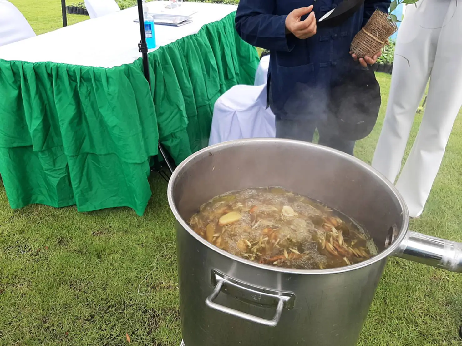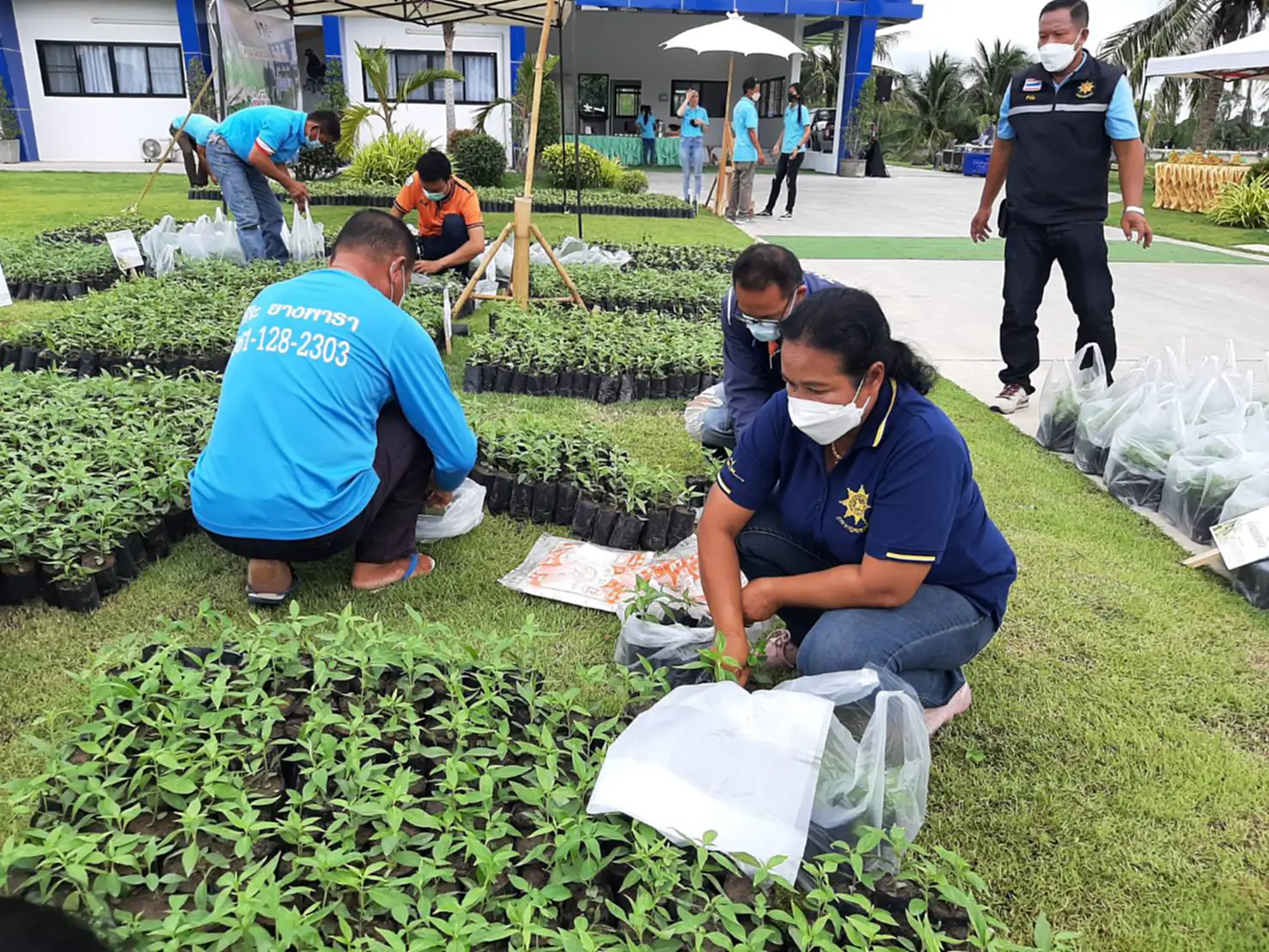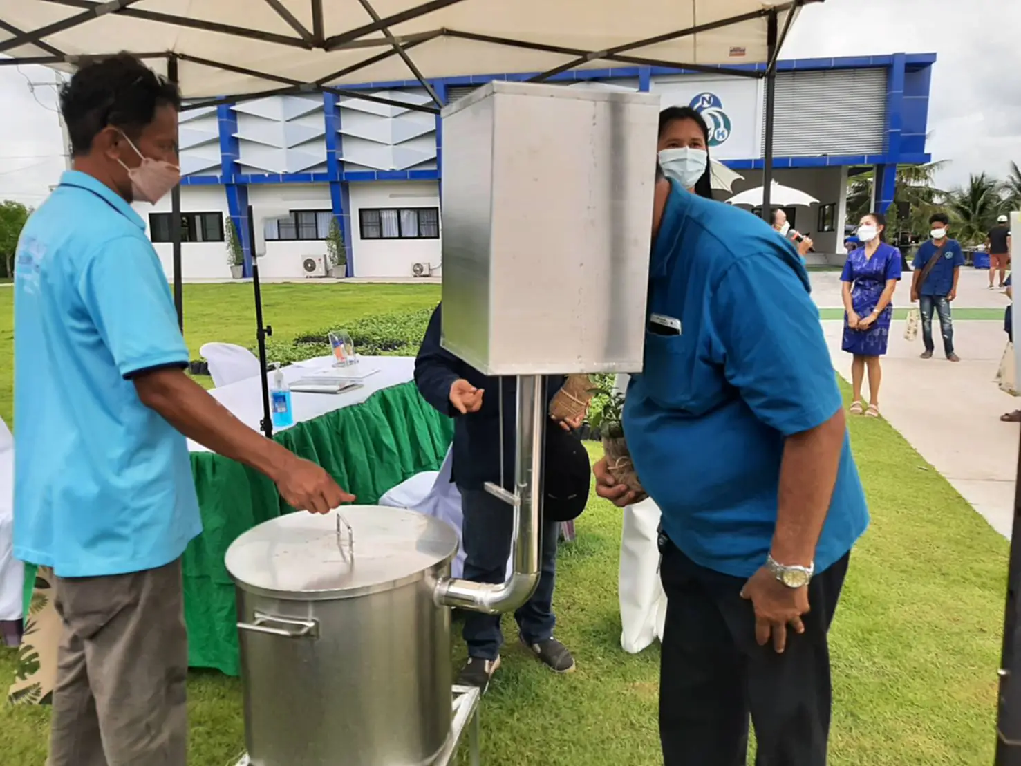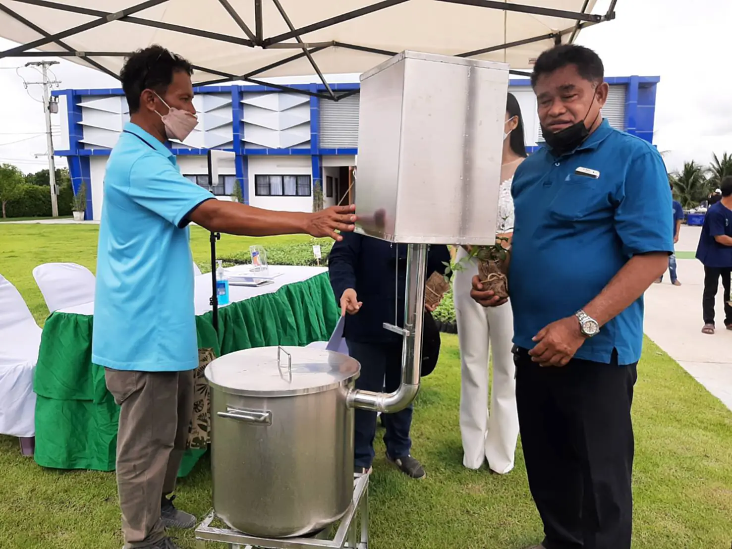 ซึ่งภายหลังจากรับมอบต้นกล้าฟ้าทะลายโจร ตัวแทนชาวบ้านหลายคนก็ได้มาร่วมทดลองใช้เครื่องสูดดมไอน้ำที่ได้จากการต้มสมุนไพรจากหม้อต้มขนาดใหญ่ ที่ทางห้างหุ้นส่วนจำกัด ไตรแลนด์โปรดักส์ ได้ดัดแปลงทำขึ้นมา เพื่อสูดดมไอน้ำจากสมุนไพรซึ่งมีหลายชนิด เพื่อทำให้การหายใจโล่ง และมีสุขภาพดีตามที่มีผู้ทดลองใช้ได้ผลมาแล้ว เพื่อเป็นต้นแบบให้กับผู้นำชุมชนที่มาในวันนี้ ได้นำไปเป็นตัวอย่าง เผื่อจะได้นำไปทำไว้ใช้ในสถานกักกันตัวในพื้นที่ ให้ผู้พักคอยได้สูดดมสมุนไพร จะได้มีสุขภาพดีมีภูมิต้านทางโรคต่อไปด้วย