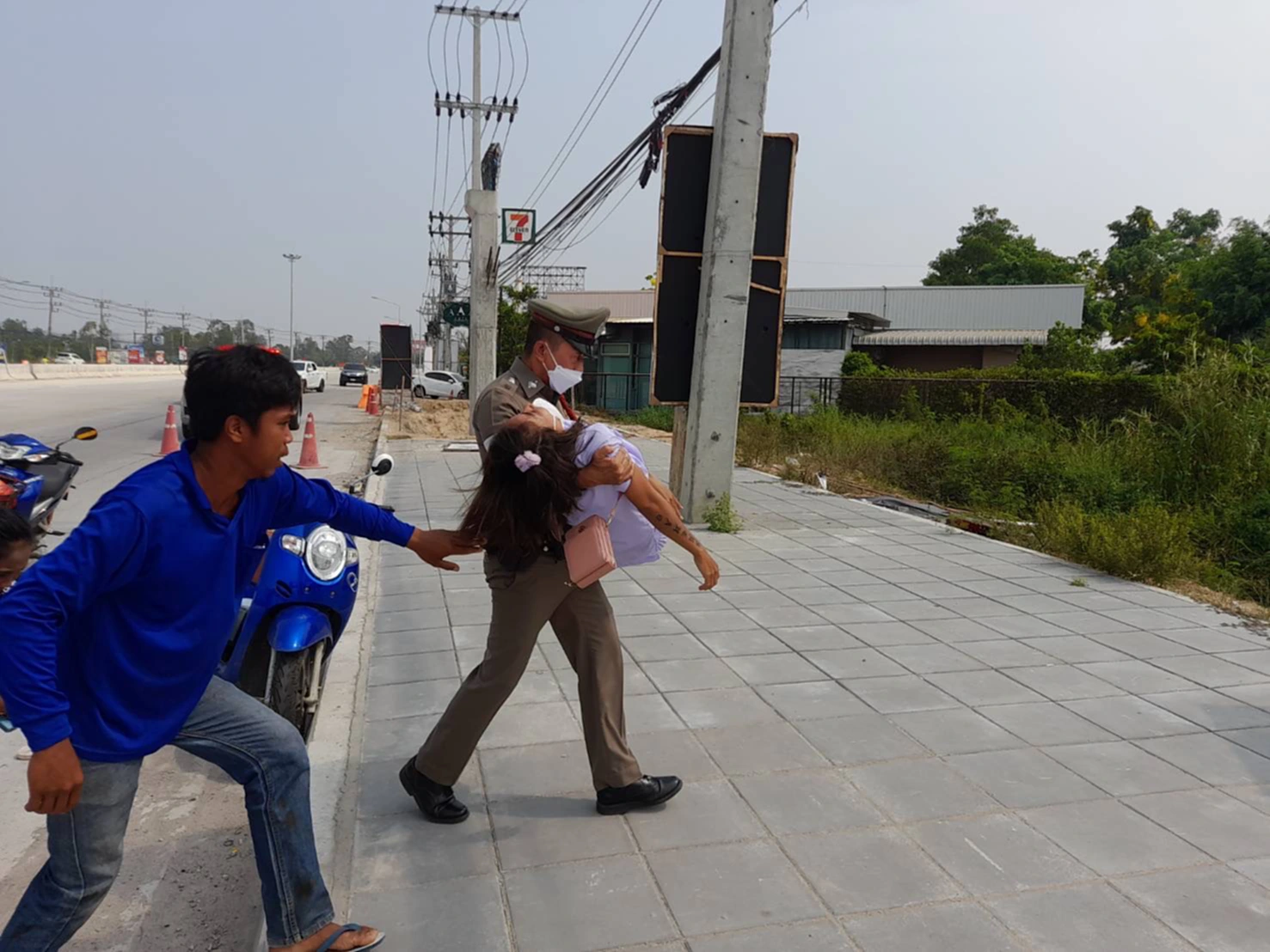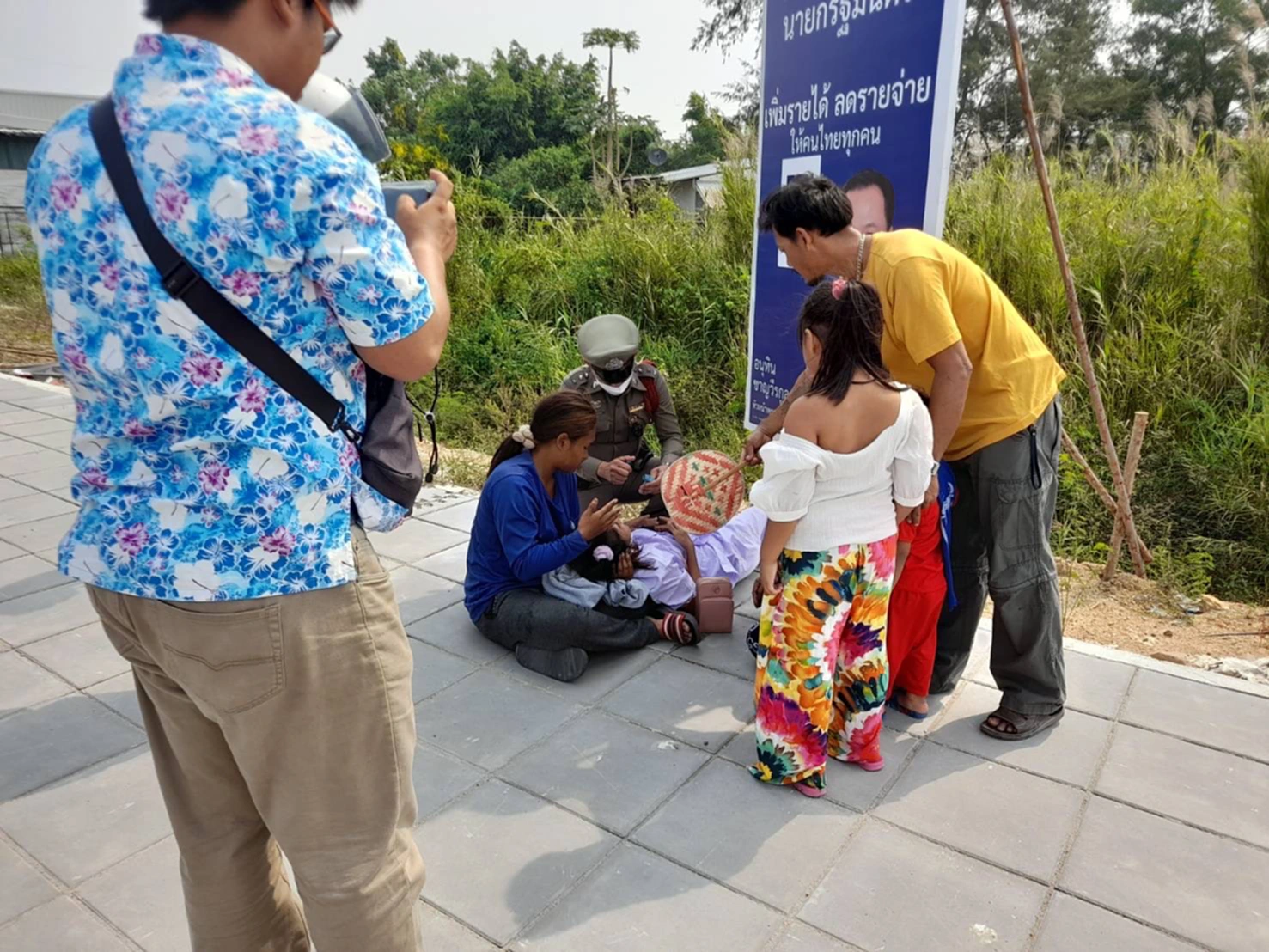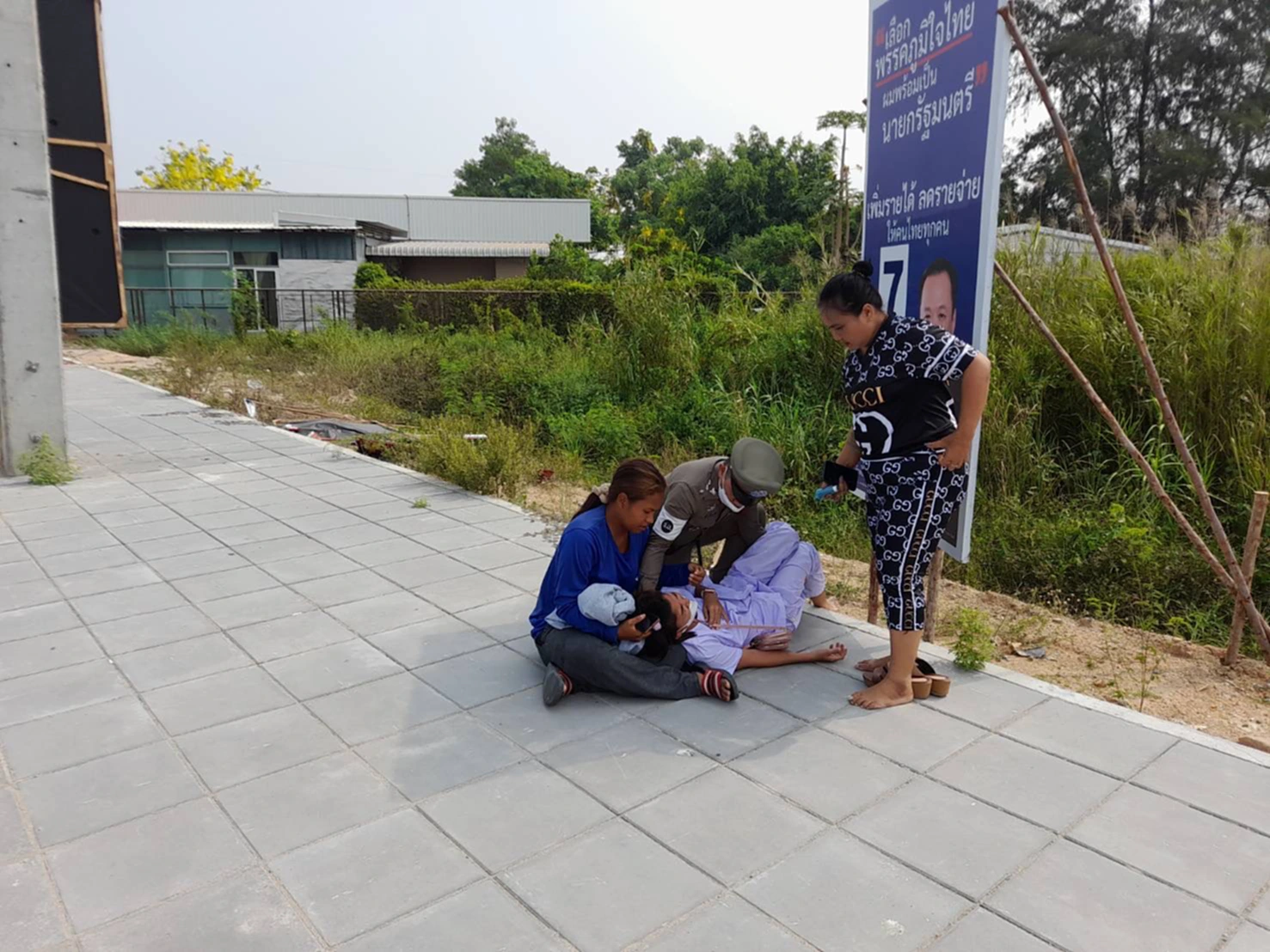 เบื้องต้นในที่เกิดเหตุพบหญิงใส่ชุดขาวนอนอยู่กลางแดดริมถนน แต่ยังไม่หมดสติ มีลักษณะเกร็งตัว ขบกัดฟัน มือกำแน่น สอบถามแล้วพบว่ามีโรคประจำตัวคือหอบหืด และพบยาสำหรับใช้พ่น จึงได้อุ้มร่างผู้ประสบเหตุเข้ามาในที่ร่มบนฟุตบาท เพื่อปฐมพยาบาลเบื้องต้นและช่วยพ่นยาให้ก่อนเพื่อประคองอาการ เนื่องจากผู้ประสบเหตุมือ เท้าอ่อนแรง ยังหยิบยาพ่นด้วยตนเองไม่สะดวก จากนั้นได้ประสานรถกู้ภัย พร้อมติดต่อญาติ ซึ่งทราบภายหลังว่าพักอยู่ในหมู่บ้านเอื้ออาทร ให้รับทราบและนำตัวส่ง ร.พ.