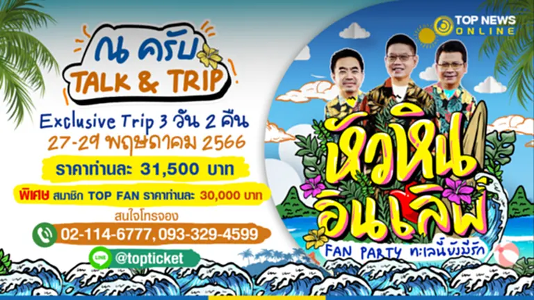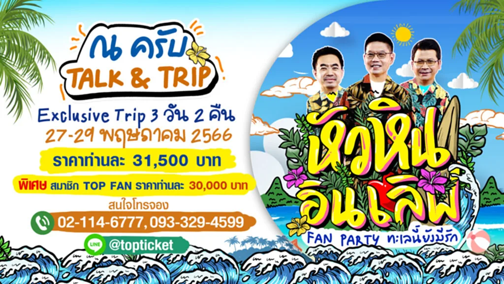 กลับมาอีกครั้งตามคำเรียกร้อง ณ ครับ Talk & Trip ชวนแฟนรายการร่วมท่องเที่ยวสุด Exclusive แบบใกล้ชิดกับผู้ประกาศที่คุณรัก กนก-ธีระ-สันติสุข จัดเต็มความสนุก 3 วัน 2 คืน ‘หัวหินอินเลิฟ ทะเลนี้ยังมีรัก’ 27-29 พฤษภาคมนี้ เที่ยวสนุก กินหรูอยู่สบายทุกมื้อทุกวันจัดเต็ม พร้อมพักผ่อนแบบพรีเมียมในรีสอร์ทติดทะเล ที่ Hua Hin Marriott Resort & Spa และพบกับปาร์ตี้ลืมวัยในแบบฮาวาย ทั้งร้อง เล่น เต้น และทอล์คโชว์พิเศษหลังเลือกตั้งของสามพิธีกรหนุ่มที่ทุกคนรอคอย