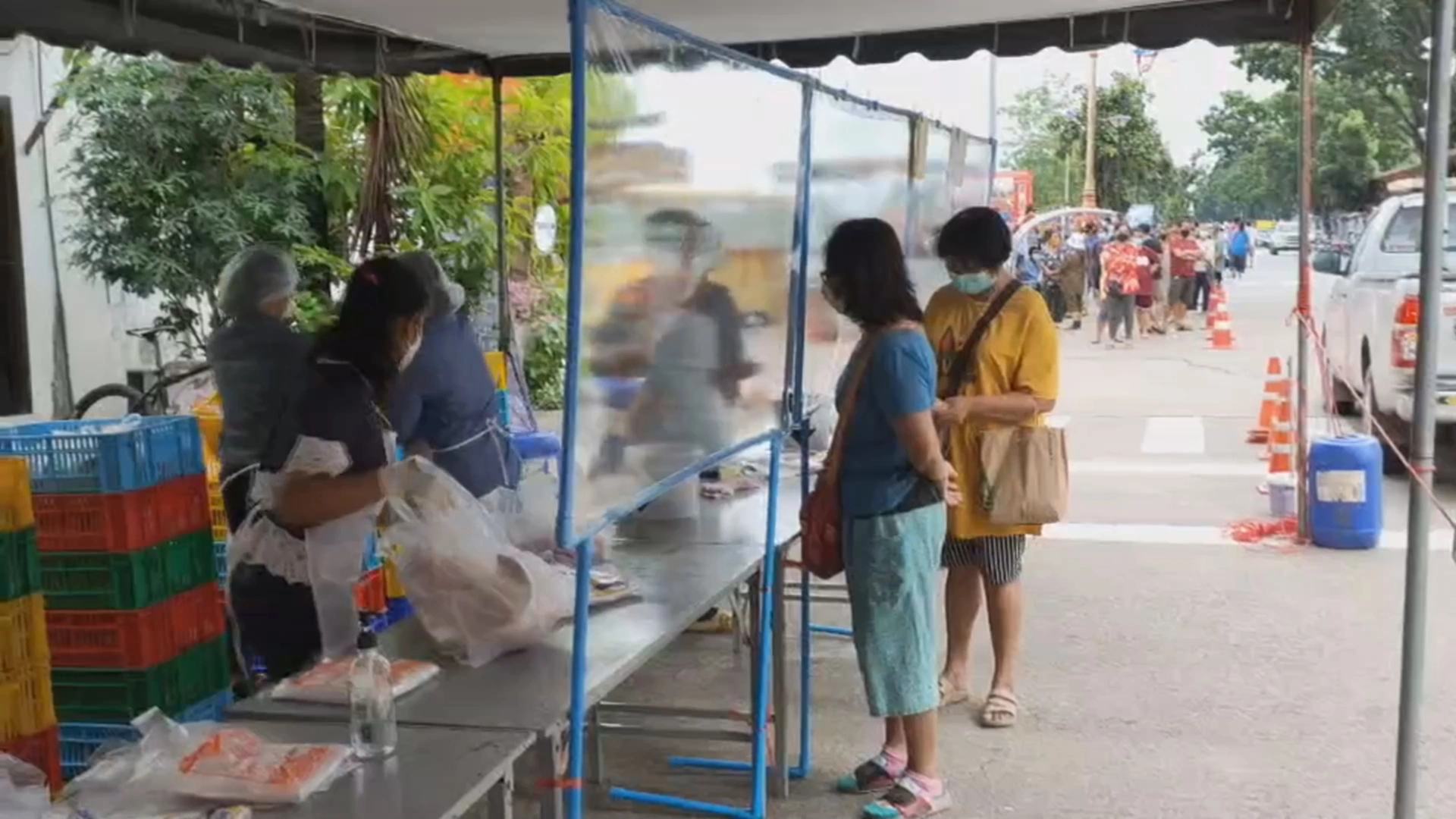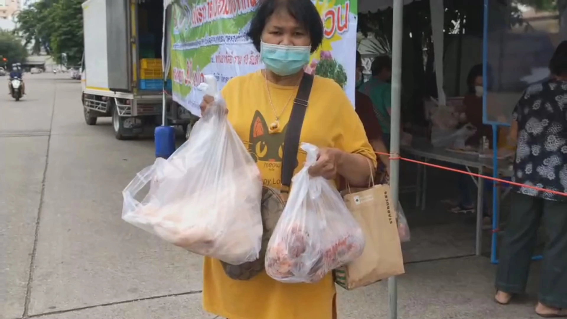 ส่วนน.ส วาสนา ศรีคูณ อายุ 47 ปี ตนทำงานเป็นพนักงานเสิร์ฟ ร้านอาหาร บอกว่า ได้รับผลกระทบจากโควิด เพราะต้องทำงานวันเว้นวัน ไม่ได้ทำงานทุกวัน ตนคิดว่าโครงการนี้ช่วยลดค่าใช้จ่ายได้มาก ตนมาซื้อเนื้อหมูจำนวน 4 กิโลกรัม เพื่อทำอาหาร และนำไปทำเนื้อหมูแดดเดียว เพื่อเก็บไว้กินได้นานๆ เพราะโควิดตนกับครอบครัว ก็ได้รับผลกระทบ เพราะตนเป็นคนที่หาเงินตนเดียวในบ้าน อยากให้มีการจัดแบบนี้ไปจนกว่าสถานการณ์จะดีขึ้น เพราะช่วยลดค่าใช้จ่ายได้เป็นอย่างมาก.