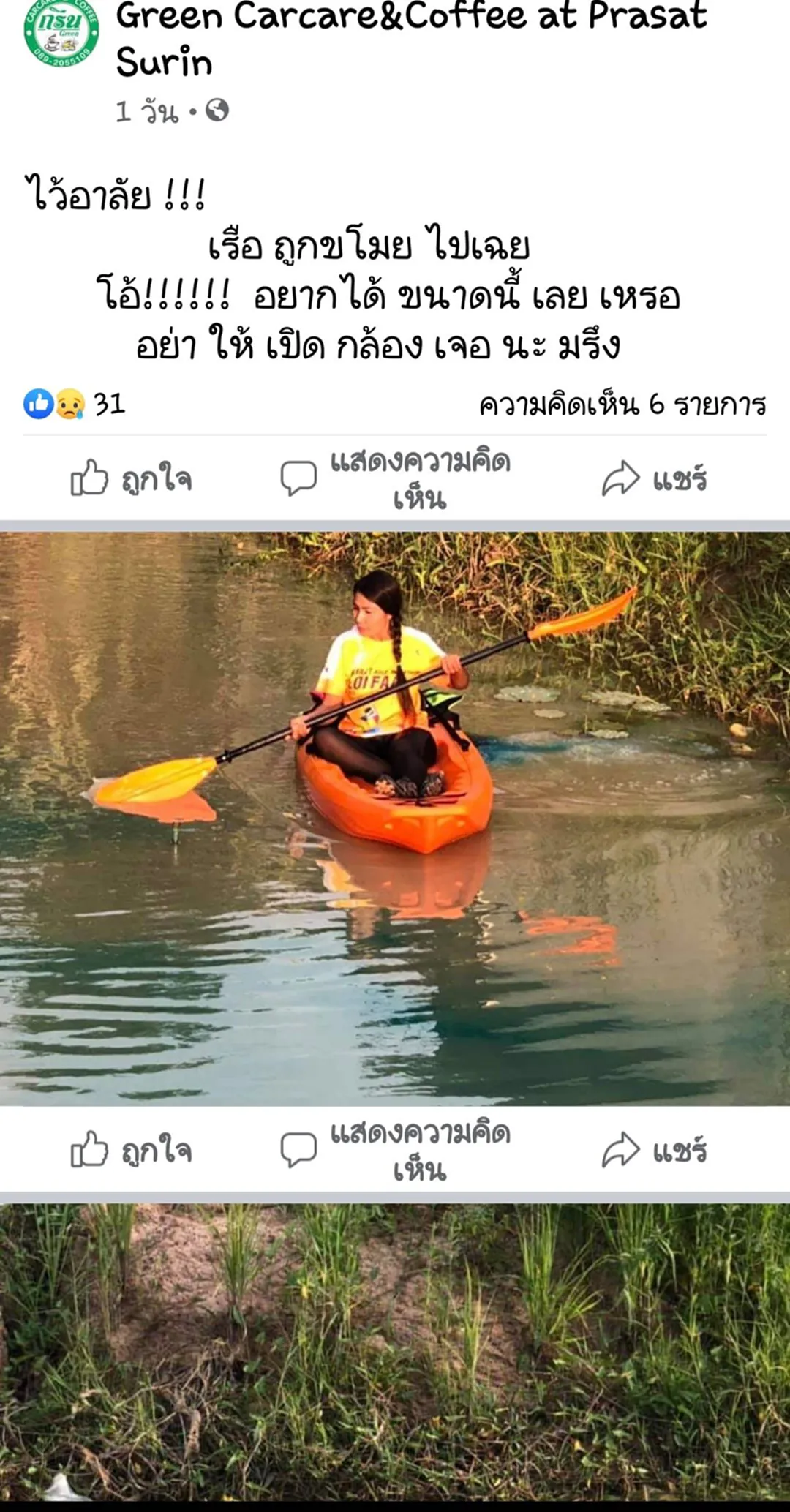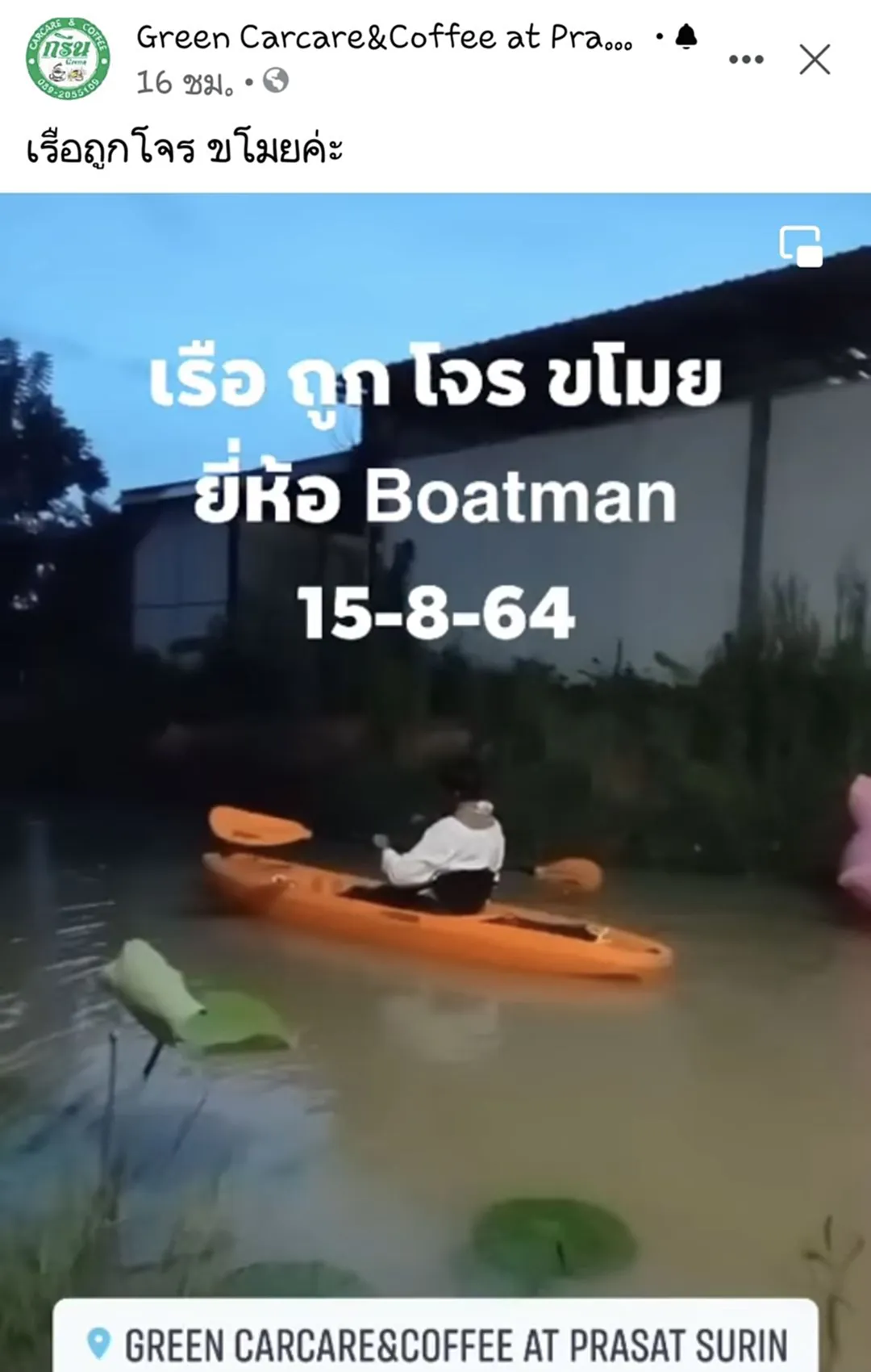 วันนี้(16 ส.ค.2564) ผู้สื่อข่าวลงพื้นที่ร้าน Green Carcare&Coffee at Prasat Surin ริมถนนสุรินทร์-ปราสาท ก่อนเข้าตัวอำเภอปราสาทอีก 8 กม. เลขที่ 261 หมู่ 2 บ้านรำเบอะ ต.เชื้อเพลิง อ.ปราสาท จ.สุรินทร์ พบกับ น.ส.สุภาวดี สีเขียว ซึ่งเป็นเจ้าของร้านและเป็นผู้โพสต์ไว้อาลัยเรือคายัค ที่หายไปเมื่อคืนวันที่ 15 ส.ค.2564 วานนี้ โดยพาทีมข่าวไปดูที่เกิดเหตุพร้อมกับชี้ว่าเรือคายัคได้ผูกไว้ที่สระน้ำคู่กันกับเรือเป่าลมเป็ด-เรือ เป่าลมหงษ์ ซึ่งในคืนวันดังกล่าวเวลาประมาณ 01.00 น. น.ส.สุภาวดี สีเขียว(เจ้าของร้าน) ได้ปิดร้านไวและได้เข้านอนแต่หัวค่ำ พอช่วงเช้ามาพบว่าเรือคายัคที่อยู่สระน้ำได้หายไป จึงรีบแจ้งเจ้าหน้าที่ตำรวจมาตรวจสอบพร้อมกับตนได้เข้าแจ้งความไว้ที่ สภ.ปราสาท จ.สุรินทร์ โดยตนได้พูดทิ้งท้ายว่าอย่าทำแบบนี้เลย หลานพูดทุกวันว่าเขาเอาเรือมาคืนยังครับย่า ตนอยากจะบอกกับคนที่เอาไปว่าถ้ายังไงก็เอามาคืนเถอะนะ