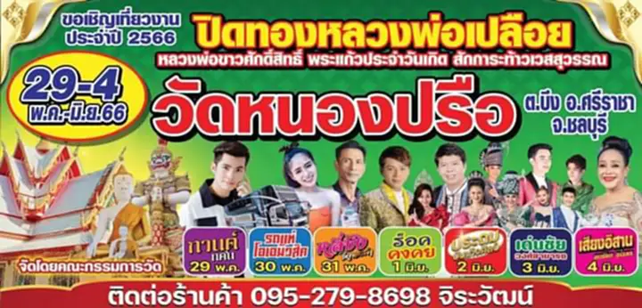พระปลัดเสมียน ฐิตสาโร เจ้าวาสวัดหนองปรือ ตำบลบึง อำเภอศรีราชา จังหวัดชลบุรี ได้เปิดเผยว่า ทางคณะกรรมวัดหนองปรือ ร่วมกับ นายชัยณรงค์ ทองศิริ “กำนันบราวน์” กำนันตำบลบึงและผู้ใหญ่บ้านในพื้นที่ตำบลบึง คณะกรรมการชุมชน ร่วมกันจัดงานประจำปี ปิดทองหลวงพ่อเปลือย อดีตเจ้าอาวาสวัดหนองปรือ สักการะท้าวเวสสุวรรณ และไหว้ หลวงพ่อขาวศักดิ์สิทธิ์ ,พระแก้วประจำวันเกิด ฯ โดยงานประจำปีจะจัดขึ้่นในวันที่ 29 พ.ค.- 04 มิ.ย.2566 รวม 7 วัน 7 คืน ภายในงานมีกิจกรรมตักไข่การกุศล บัตรการกุศลชิงโชคลุ้นรถจักรยานยนต์ จำนวน 2 คัน ร้านค้าของกิน ของเล่นมากมาย ดนตรีชื่อดัง หมอลำ จัดงานอย่างยิ่งใหญ่อลังกาล โดยงานนี้ทางคณะกรรมการวัดหนองปรือร่วมกับผู้นำท้องถิ่นจัดงานขึ้นกันเอง