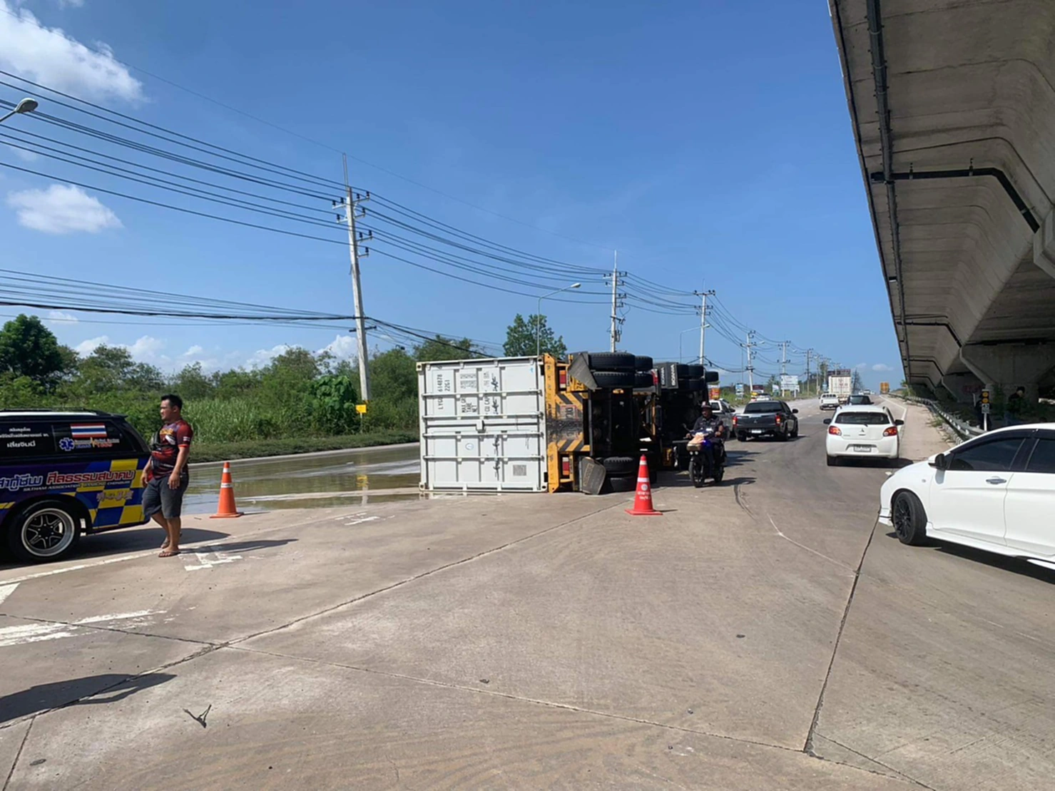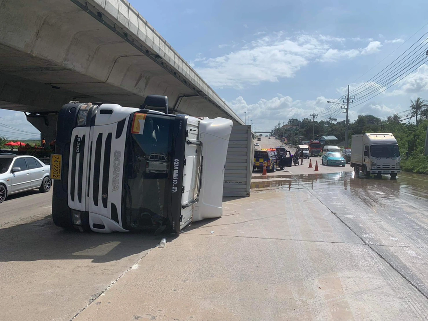 ระทึก รถบรรทุกสารเคมีพลิกคว่ำ สารเคมีรั่วไหลเต็มพื้นถนน