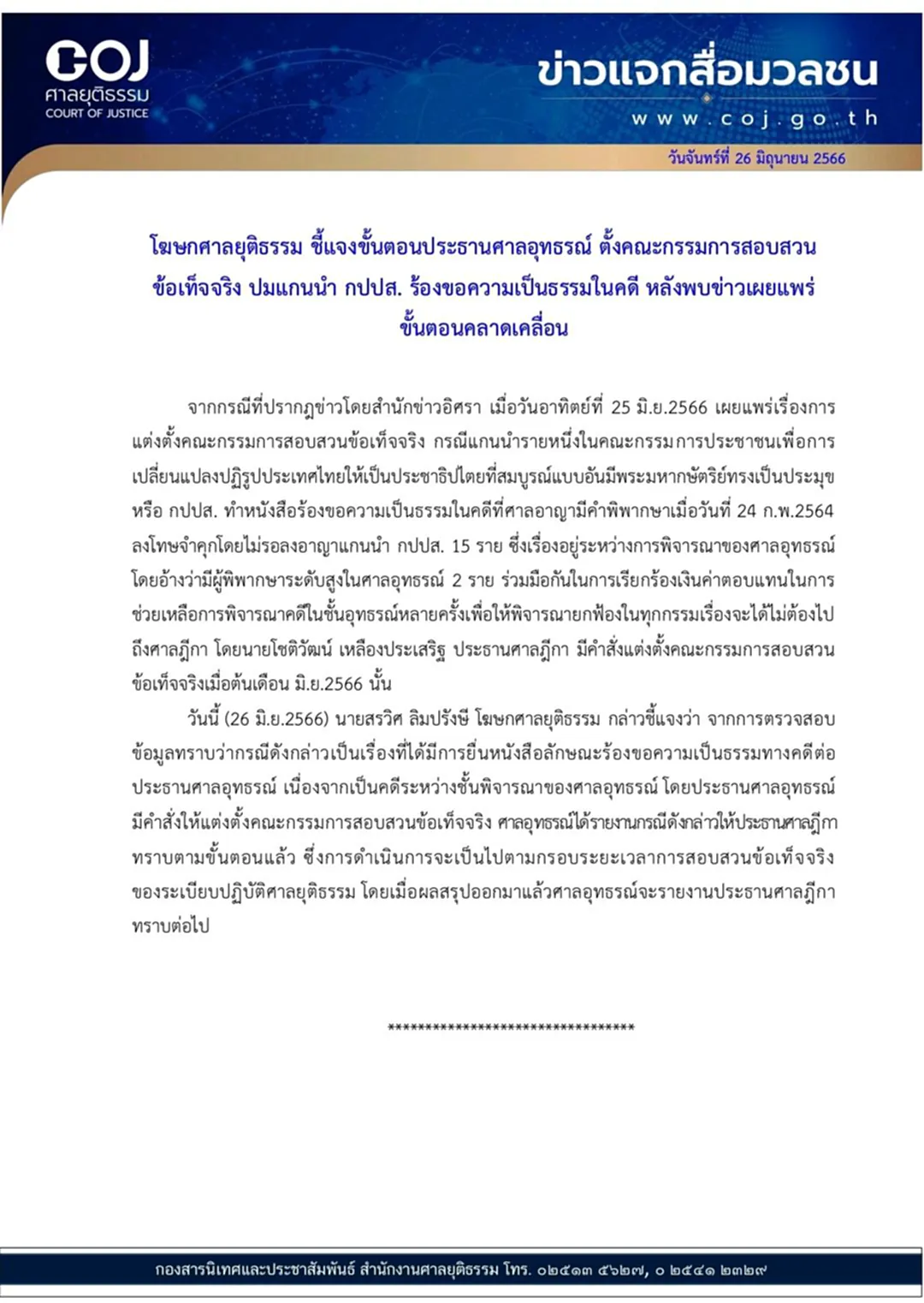 จากกรณีที่ปรากฎข่าวโดยสำนักข่าวอิศรา เมื่อวันอาทิตย์ที่ 25 มิ.ย.2566 เผยแพร่เรื่องการแต่งตั้งคณะกรรมการสอบสวนข้อเท็จจริง กรณีแกนนำรายหนึ่งในคณะกรรมการประชาชนเพื่อการเปลี่ยนแปลงปฏิรูปประเทศไทยให้เป็นประชาธิปไตยที่สมบูรณ์แบบอันมีพระมหากษัตริย์ทรงเป็นประมุข หรือ กปปส. ทำหนังสือร้องขอความเป็นธรรมในคดีที่ศาลอาญามีคำพิพากษาเมื่อวันที่ 24 ก.พ.2564 ลงโทษจำคุกโดยไม่รอลงอาญาแกนนำ กปปส. 15 ราย ซึ่งเรื่องอยู่ระหว่างการพิจารณาของศาลอุทธรณ์ โดยอ้างว่ามีผู้พิพากษาระดับสูงในศาลอุทธรณ์ 2 ราย ร่วมมือกันในการเรียกร้องเงินค่าตอบแทนในการช่วยเหลือการพิจารณาคดีในชั้นอุทธรณ์หลายครั้งเพื่อให้พิจารณายกฟ้องในทุกกรรมเรื่องจะได้ไม่ต้องไปถึงศาลฎีกา โดยนายโชติวัฒน์ เหลืองประเสริฐ ประธานศาลฎีกา มีคำสั่งแต่งตั้งคณะกรรมการสอบสวนข้อเท็จจริงเมื่อต้นเดือน มิ.ย.2566 นั้น