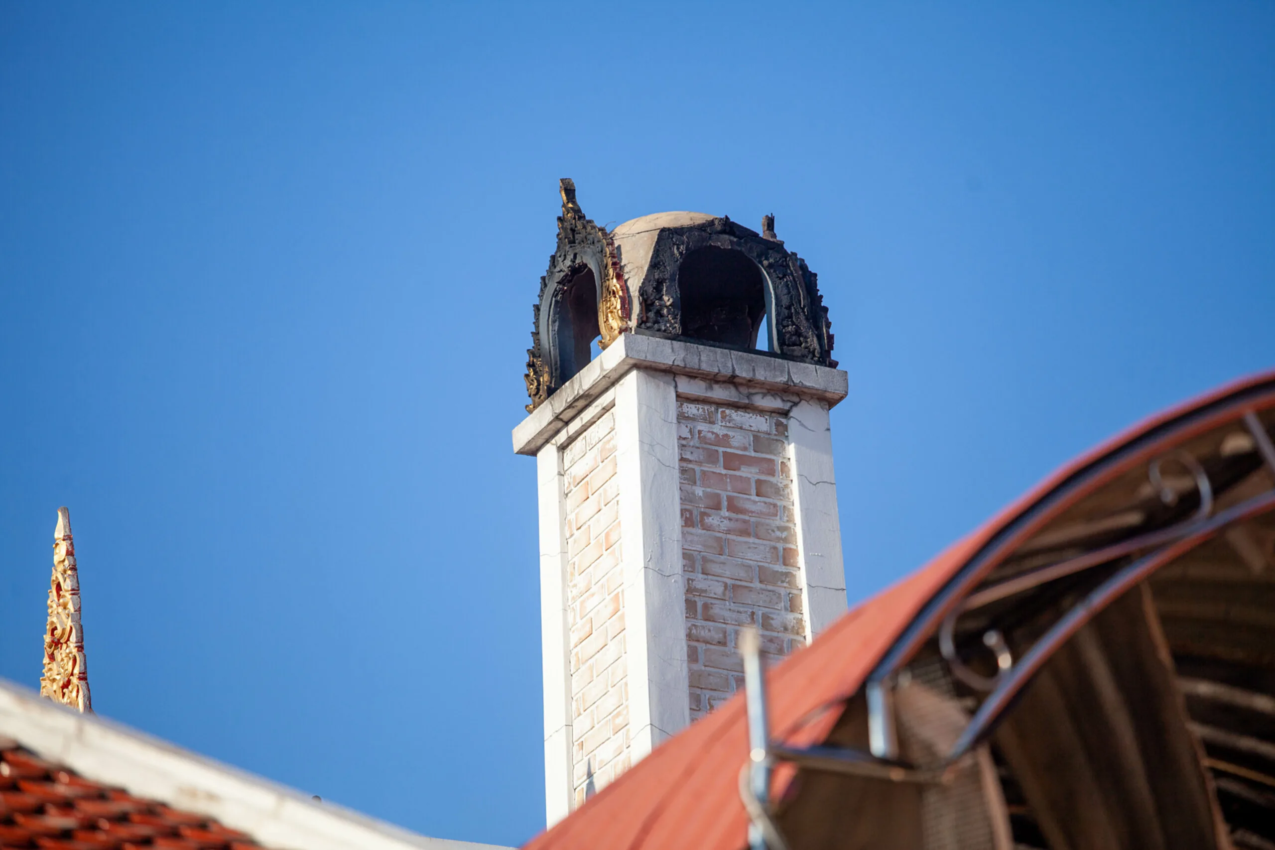 พระครูปลัดสิทธิวัฒน์ หลวงพี่น้ำฝน เจ้าอาวาสวัดไผ่ล้อม เผยว่า สถานการณ์การเสียชีวิตของผู้ที่ติดเชื้อไวรัสโควิด-19 จากตัวเลขมียอดผู้เสียชีวิตสะสมแล้วเกือบ 300 คน โดยที่วัดไผ่ล้อมได้มีการเผาศพทุกวันไม่มีวันหยุด ซึ่งปกติจะเผาอยู่ที่ 2 ศพก็ได้เพิ่มยอดการเผาเป็น 3 ศพ กระทั่งไม่นานมานี้ขณะที่กำลังทำการเผาศพผู้เสียชีวิตที่ติดเชื้อไวรัสโควิด-19 ได้เกิดเสียงดังตูมสนั่นเหมือนกับมีอะไรระเบิดบนหลังคาเมรุ ซึ่งทั้งพระและเจ้าหน้าที่ต่างตกใจเนื่องจากคิดว่ามีอะไรระเบิด เมื่อไปสำรวจโดยรอบก็พบว่าแป้นปูนที่เป็นลายกนกบนยอดเมรุ ได้พักพังตกลงมาบนหลังคาโชคดีที่ไม่ทะลุลงมาโดนศรีษะพระสงฆ์และคนที่อยู่ภายในงาน