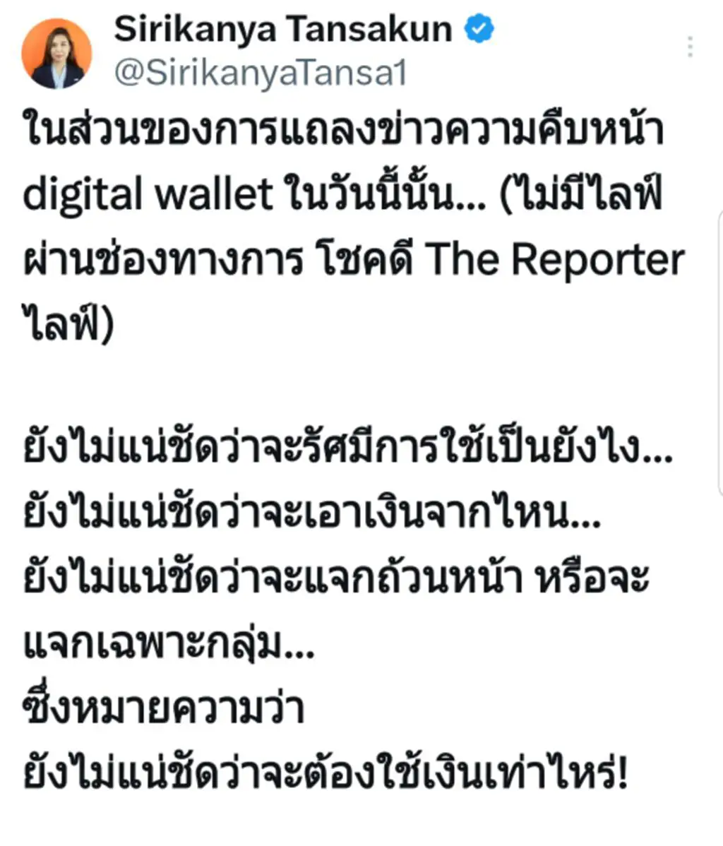 นางสาวศิริกัญญา ตันสกุล สส.และรองหัวหน้าพรรคก้าวไกล ทวิตข้อความถึงกรณีนายจุลพันธ์ อมรวิวัฒน์ รัฐมนตรีช่วยว่าการกระทรวงการคลัง แถลงนโยบายแจกเงินดิจิทัลว่า ในส่วนของการแถลงข่าวความคืบหน้า digital wallet ในวันนี้นั้น