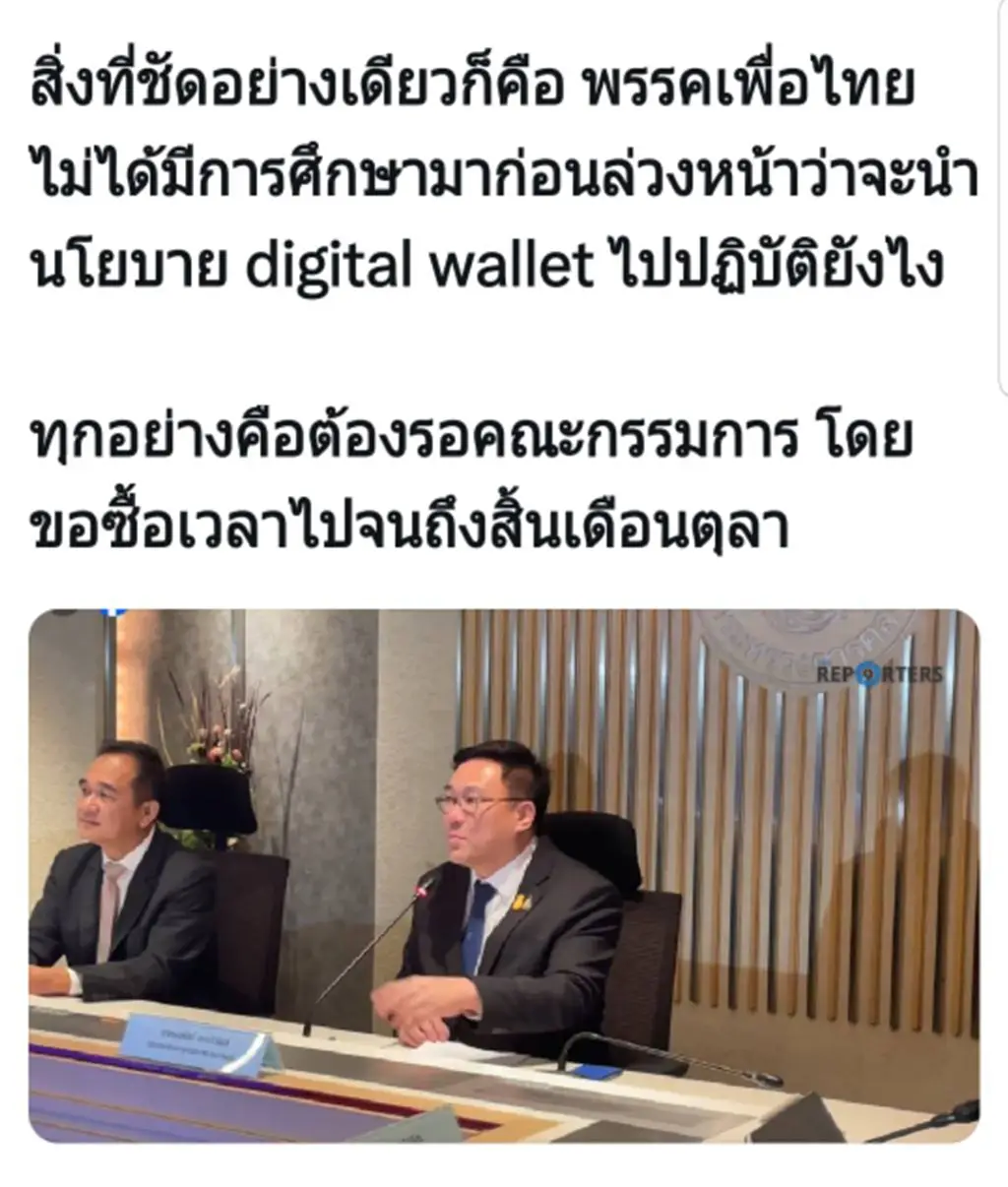 สิ่งที่ชัดอย่างเดียวก็คือ พรรคเพื่อไทยไม่ได้มีการศึกษามาก่อนล่วงหน้าว่าจะนำนโยบาย digital wallet ไปปฏิบัติยังไง ทุกอย่างคือต้องรอคณะกรรมการ โดยขอซื้อเวลาไปจนถึงสิ้นเดือนตุลา