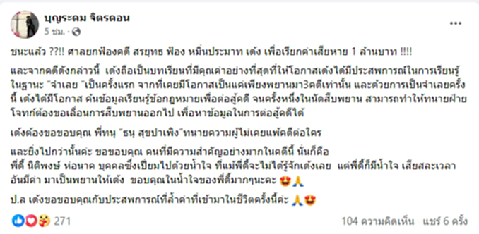 วันที่ 13 พ.ย.2566 น.ส.บุญระดม จิตรดอน ผู้สื่อข่าวอาวุโส สายทำเนียบรัฐบาล อดีตผู้สื่อข่าวสำนักข่าวเอเอฟพี ได้โพสต์เฟชบุ๊กระบุว่า ชนะแล้ว ศาลยกฟ้องคดีสรยุทธ ฟ้องหมิ่นประมาท เด้ง เพื่อเรียกค่าเสียหาย 1 ล้านบาท !!!!