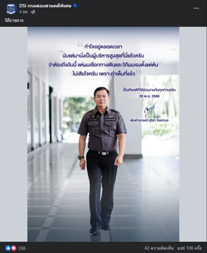 ขณะที่ก่อนหน้านี้เมื่อเวลา 11.53 น. เพจเฟซบุ๊กกรมสอบสวนคดีพิเศษ (ดีเอสไอ) เผยแพร่ภาพ พ.ต.อ.สุริยา สิงหกมล อธิบดีกรมสอบสวนคดีพิเศษ พร้อมข้อความ “วิถีราชการ” ทำใจอยู่ตลอดเวลา นับแต่มานั่งเป็นผู้บริหารสูงสุดที่นี่แล้ว ว่าต้องถึงวันนี้ แต่ตนเลือกทางเดินและวิถีตนเองตั้งแต่ต้น ไม่เสียใจเพราะทำเต็มที่แล้ว เป็นเกียรติที่ได้ร่วมงานกับทุกท่าน.